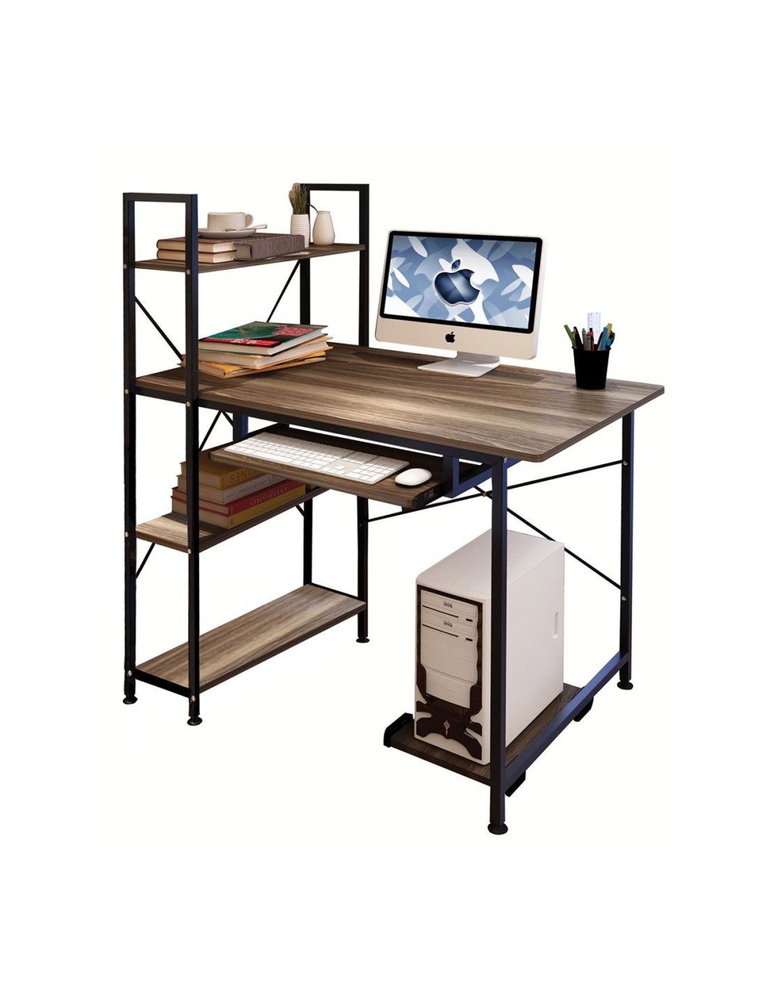 ΓΡΑΦΕΙΟ 4 Ράφια - Βάση Η-Υ - Συρταρωτή Θέση Πληκτρολογίου, Μέταλλο Μαύρο, Καρυδί