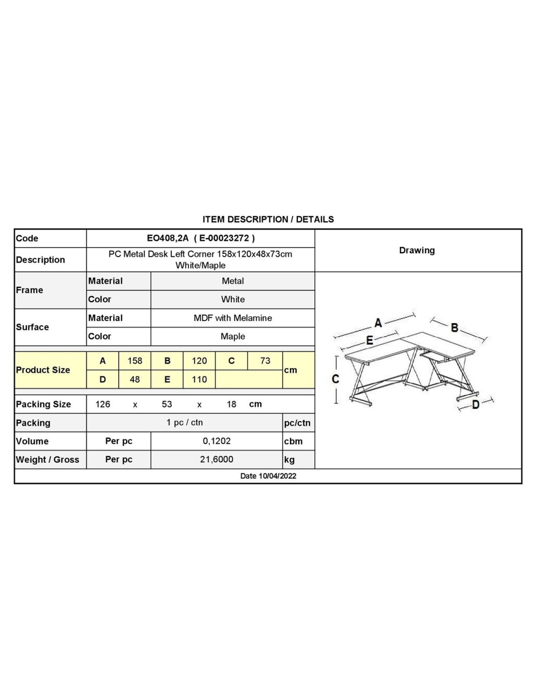 ΓΡΑΦΕΙΟ Η-Υ Γωνία, Μέταλλο Βαφή Άσπρο, Επιφάνεια Απόχρωση Maple