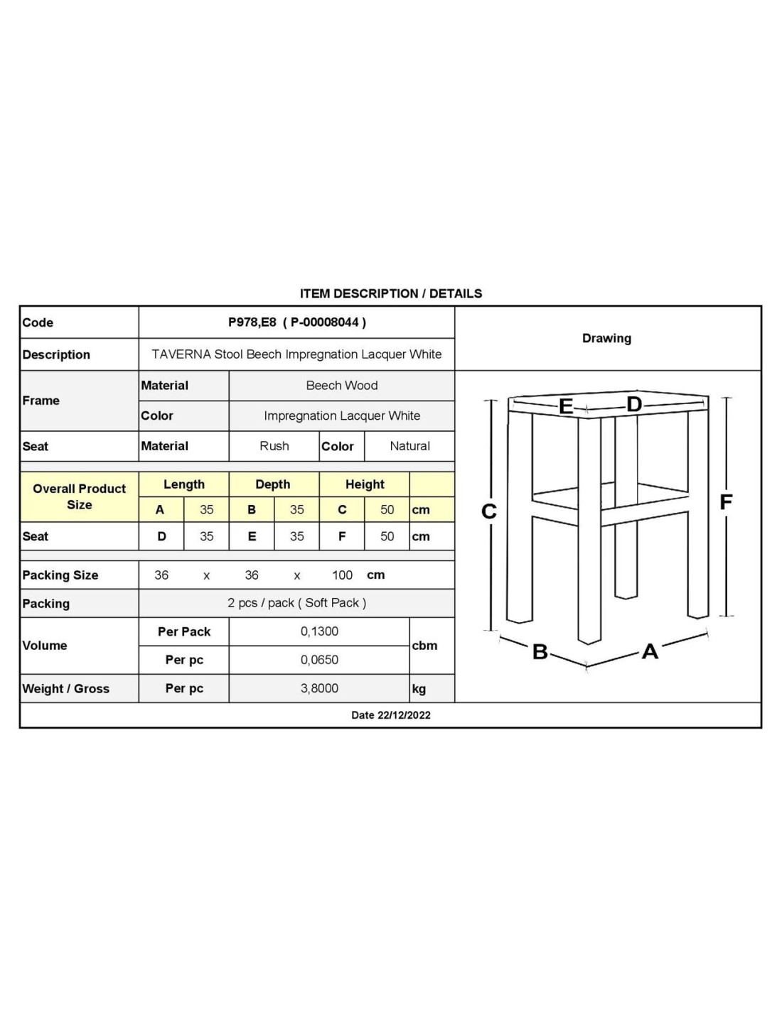 ΤΑΒΕΡΝΑΣ Σκαμπό Βοηθητικό, Οξιά Εμποτισμός Λάκα Άσπρο, Κάθισμα Ψάθα