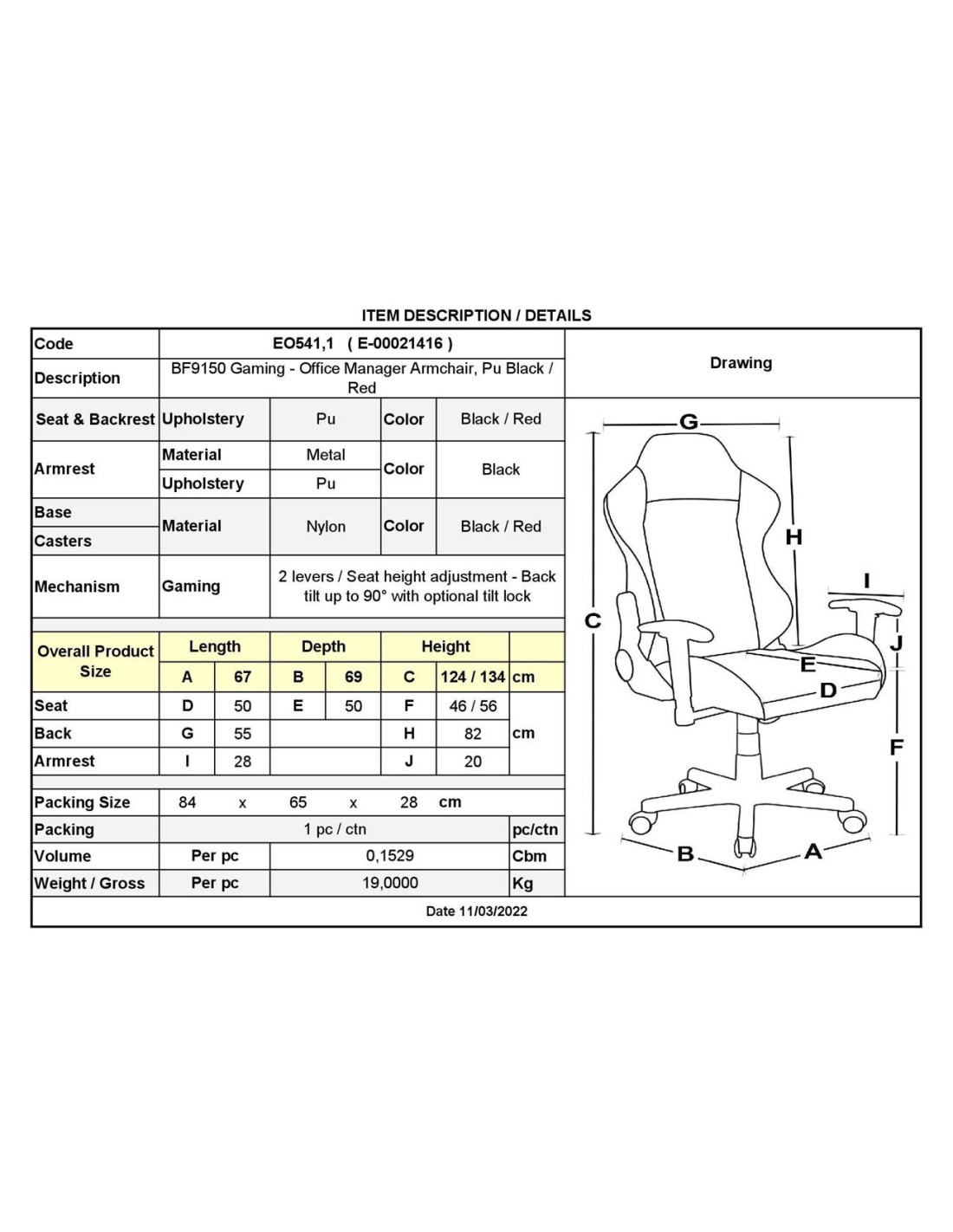 BF9150 Gaming Πολυθρόνα Γραφείου, Ανάκλιση Πλάτης έως 90°, Pu Μαύρο - Κόκκινο
