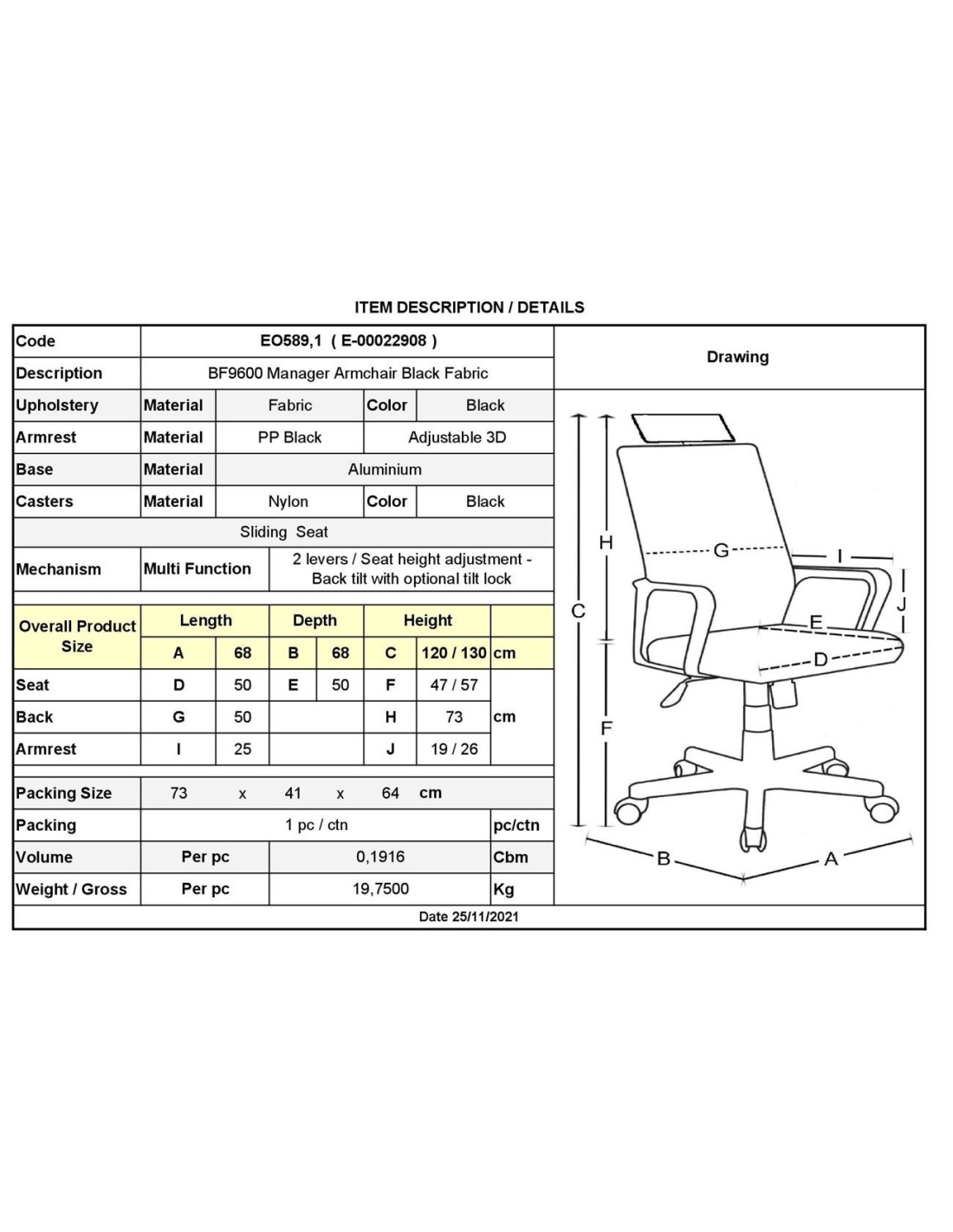 BF9600 Πολυθρόνα Γραφείου Διευθυντή, Βάση Αλουμινίου, Ύφασμα Μαύρο