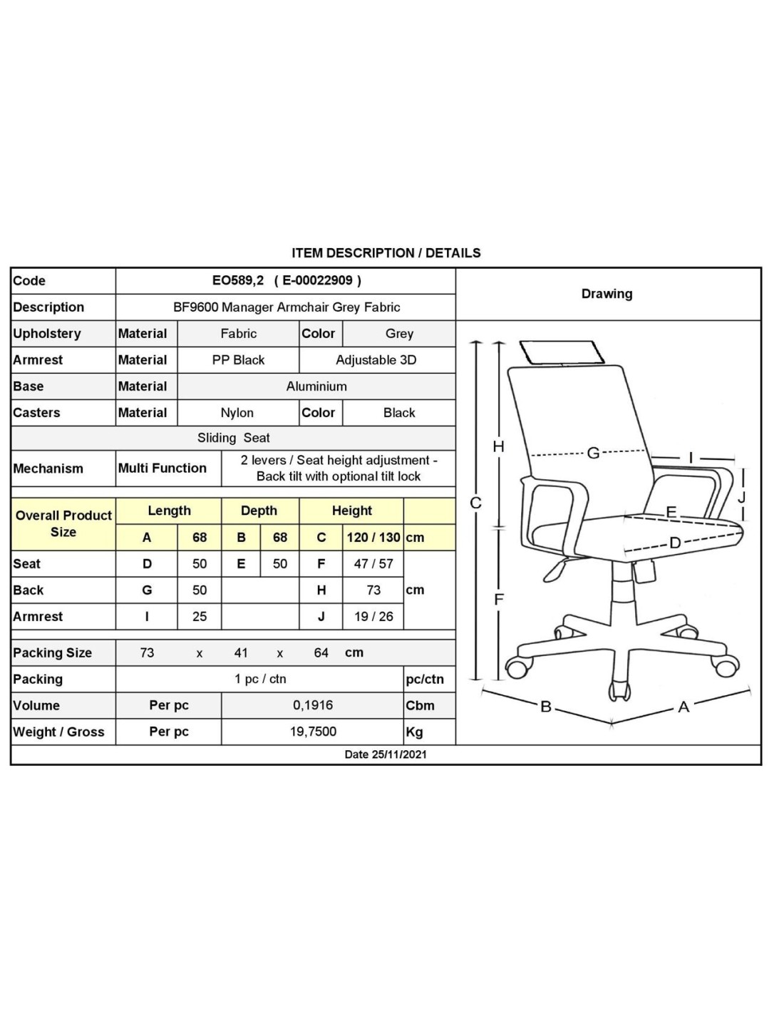 BF9600 Πολυθρόνα Γραφείου Διευθυντή, Βάση Αλουμινίου, Ύφασμα Γκρι