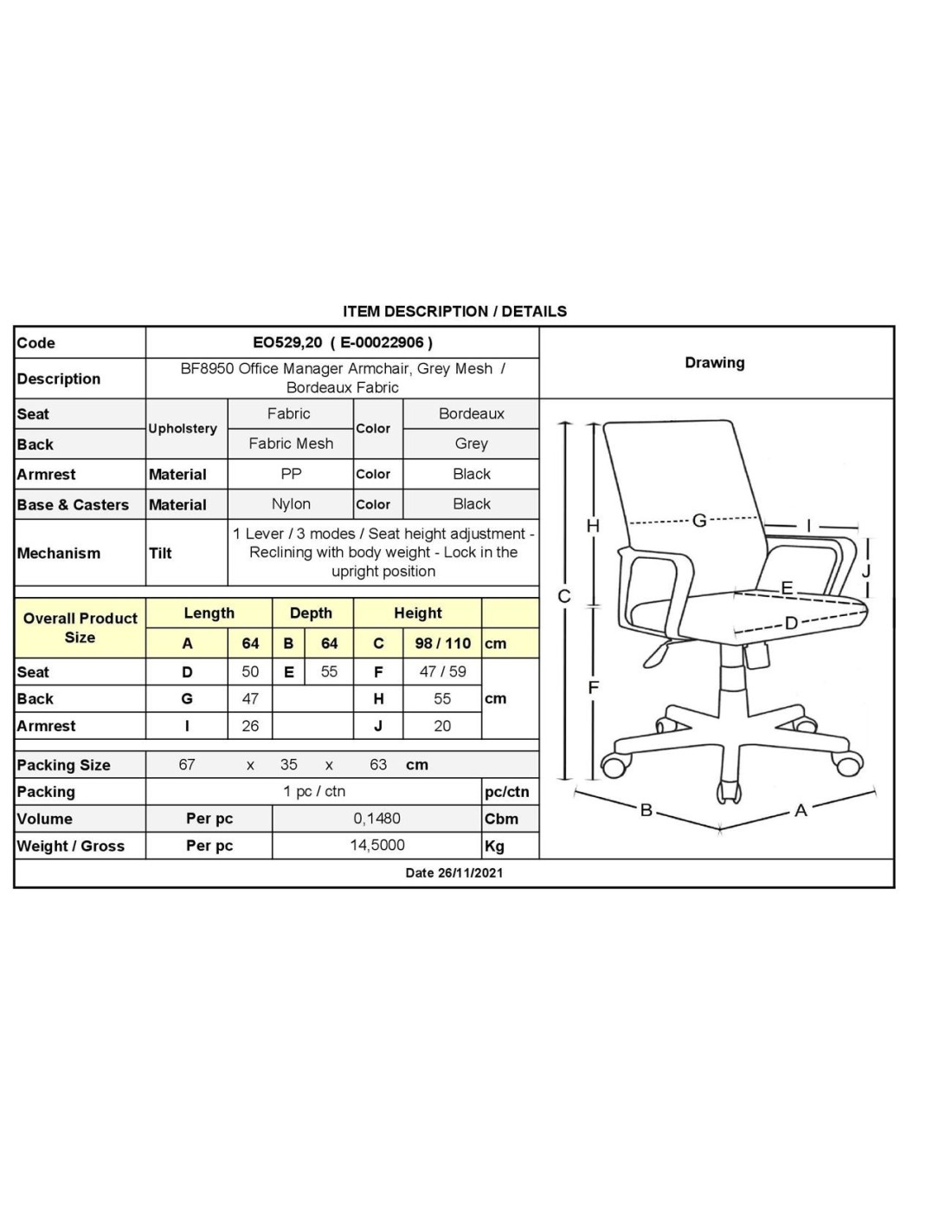 BF8950 Πολυθρόνα Γραφείου Mesh Γκρι, Ύφασμα Μπορντώ