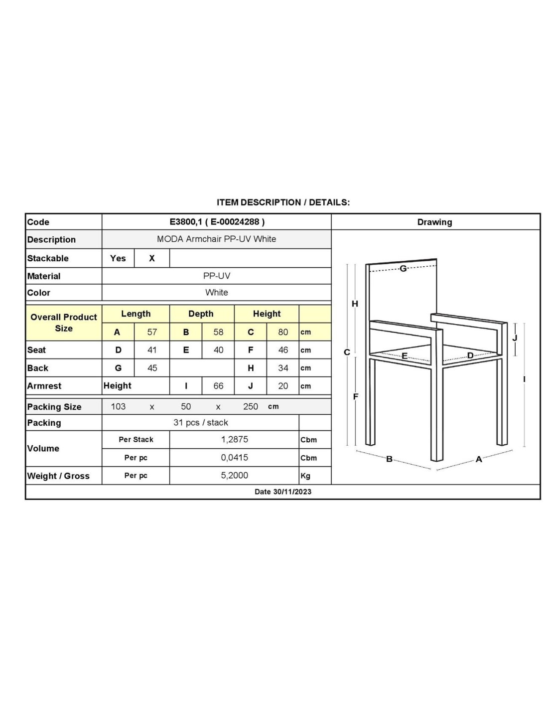 MODA Πολυθρόνα-Pro Στοιβαζόμενη, PP-UV Protection Απόχρωση Άσπρο