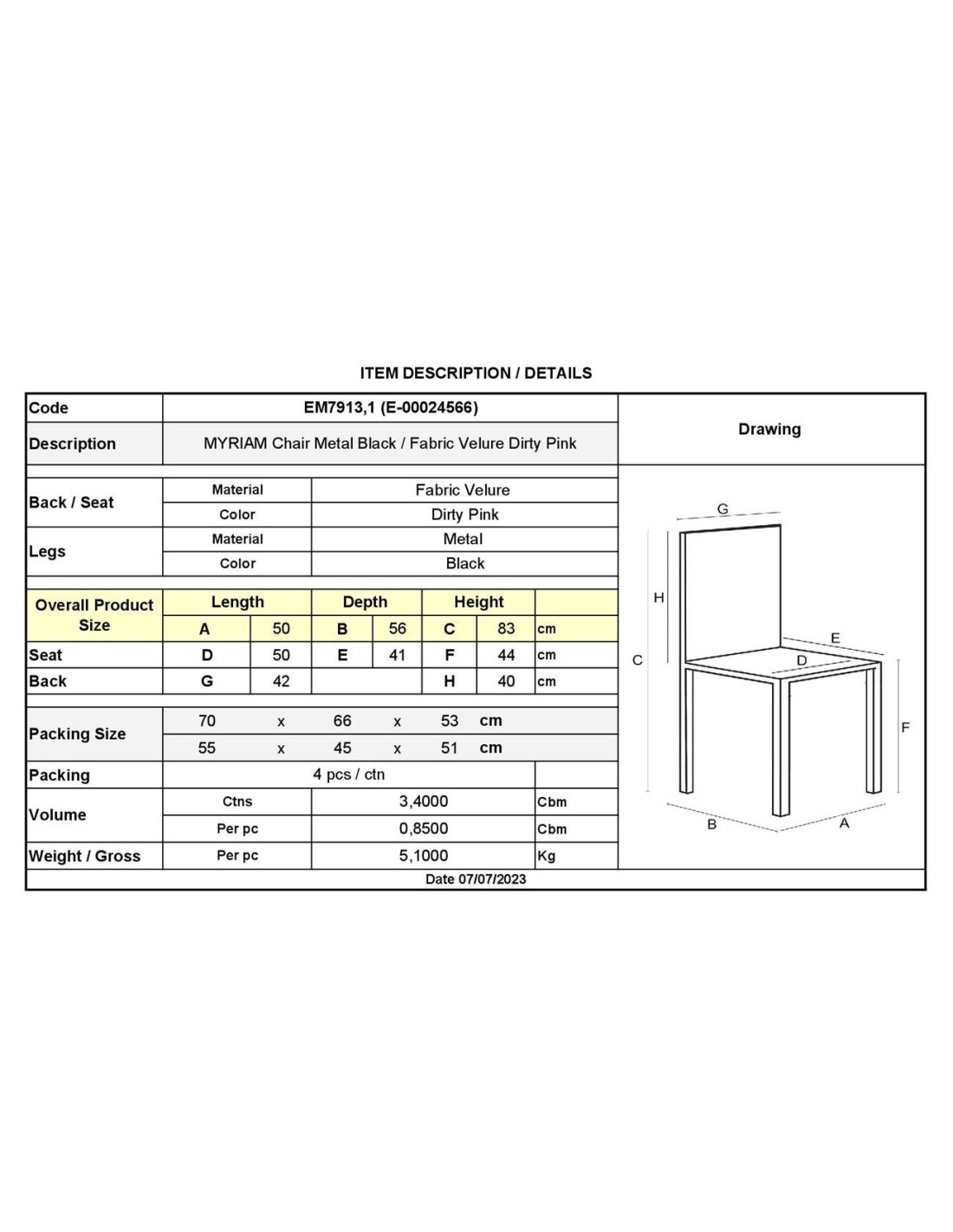 MYRIAM Καρέκλα Τραπεζαρίας, Μέταλλο Βαφή Μαύρο, Ύφασμα Velure Dirty Pink ( Συσκ.6 )