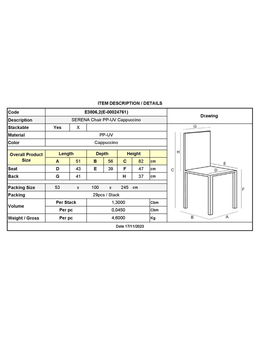 SERENA Καρέκλα, Στοιβαζόμενη PP - UV Cappuccino