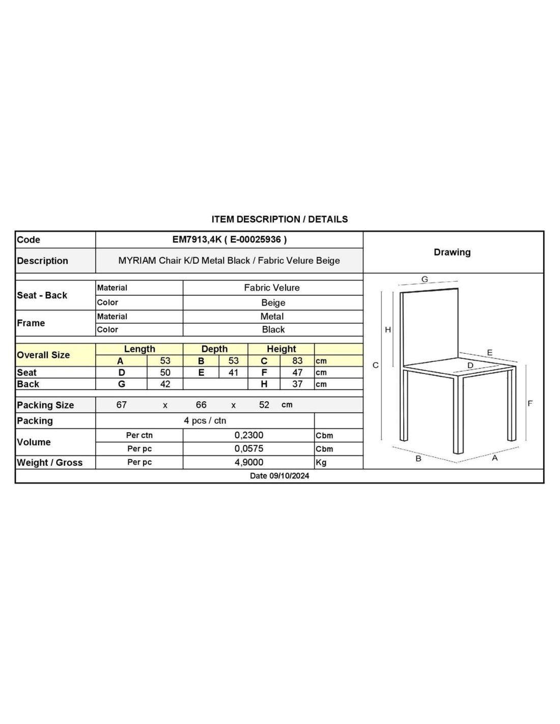 MYRIAM K-D Καρέκλα Τραπεζαρίας Μέταλλο Βαφή Μαύρο, Ύφασμα Velure Camel ( Συσκ.4 )