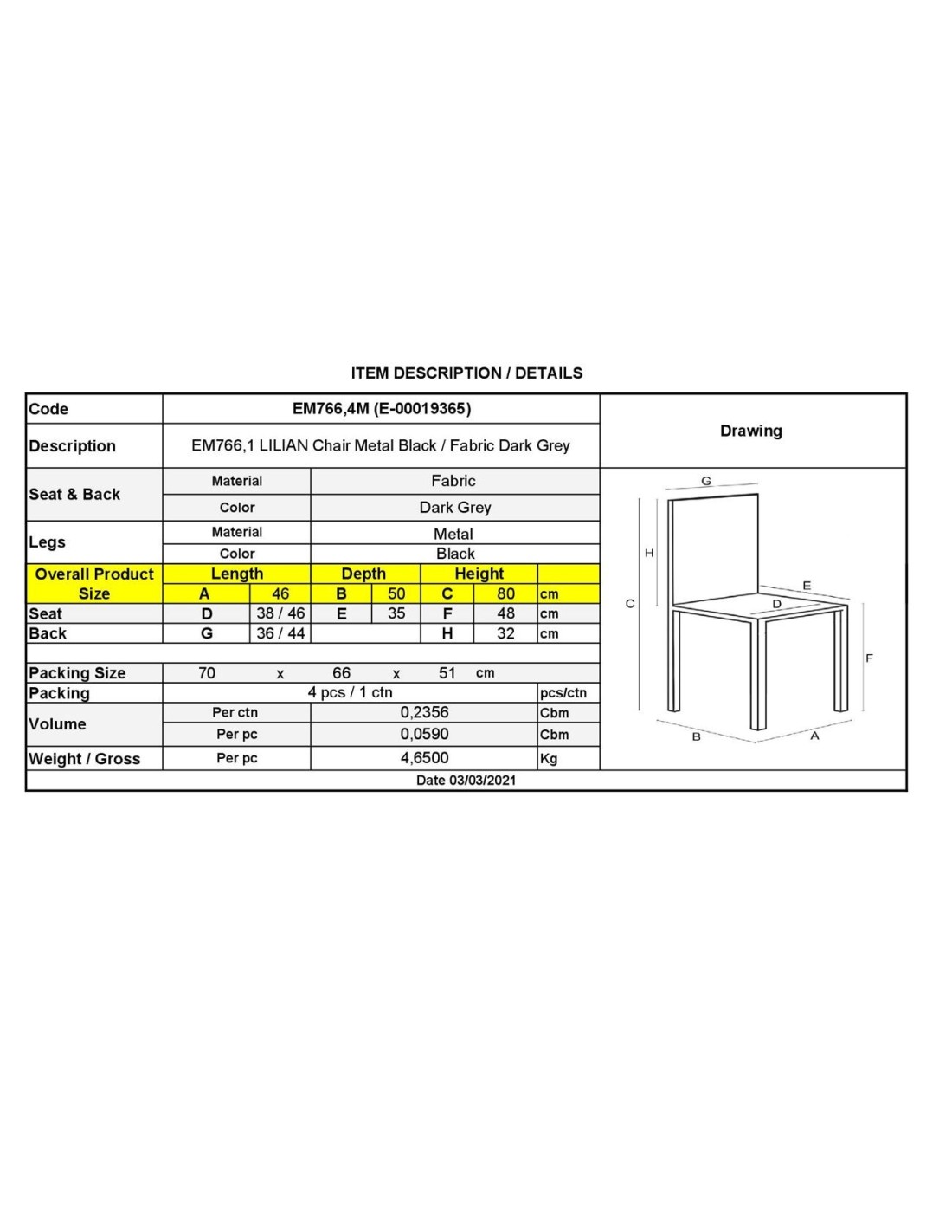 LILIAN Καρέκλα Τραπεζαρίας Μέταλλο Βαφή Μαύρο, Ύφασμα Σκούρο Γκρι