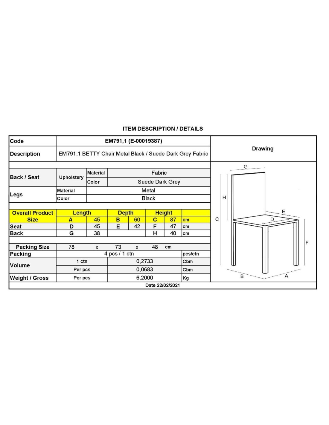 BETTY Καρέκλα Μέταλλο Βαφή Μαύρο, Ύφασμα Suede Ανθρακί