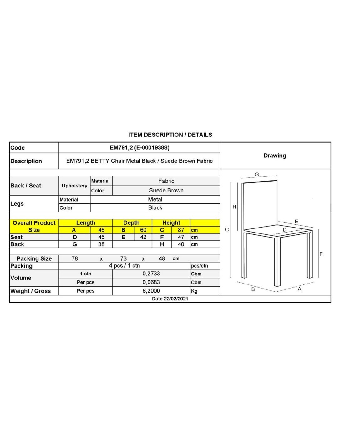 BETTY Καρέκλα Μέταλλο Βαφή Μαύρο, Ύφασμα Suede Καφέ