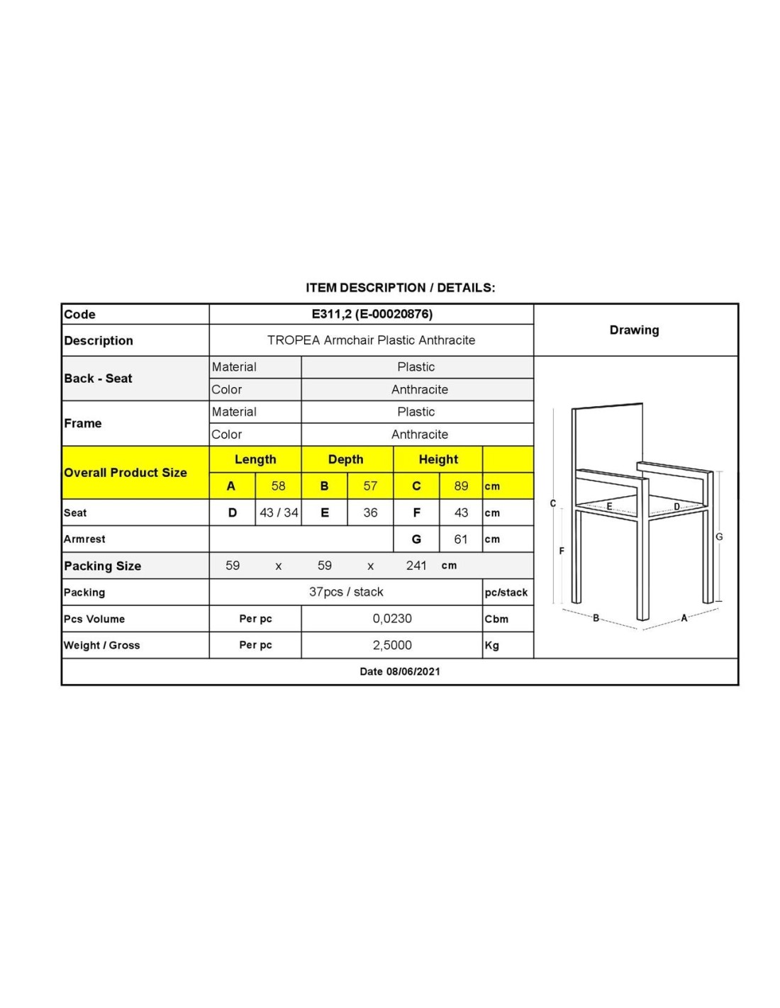 TROPEA Πολυθρόνα Τραπεζαρίας Κήπου - Βεράντας Στοιβαζόμενη, PP Απόχρωση Ανθρακί