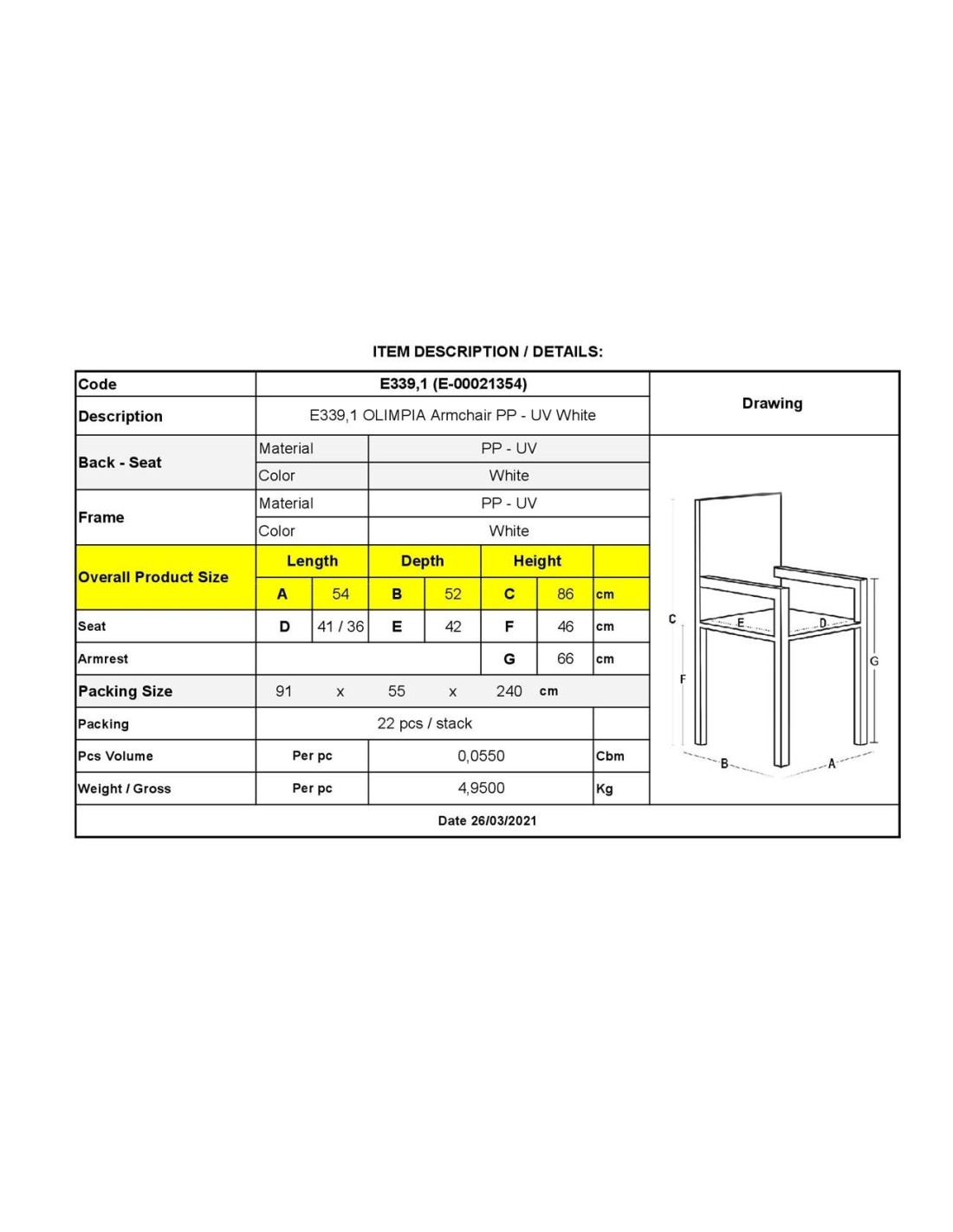 OLIMPIA Πολυθρόνα Τραπεζαρίας Κήπου Στοιβαζόμενη, PP - UV Protection, Απόχρωση Άσπρο