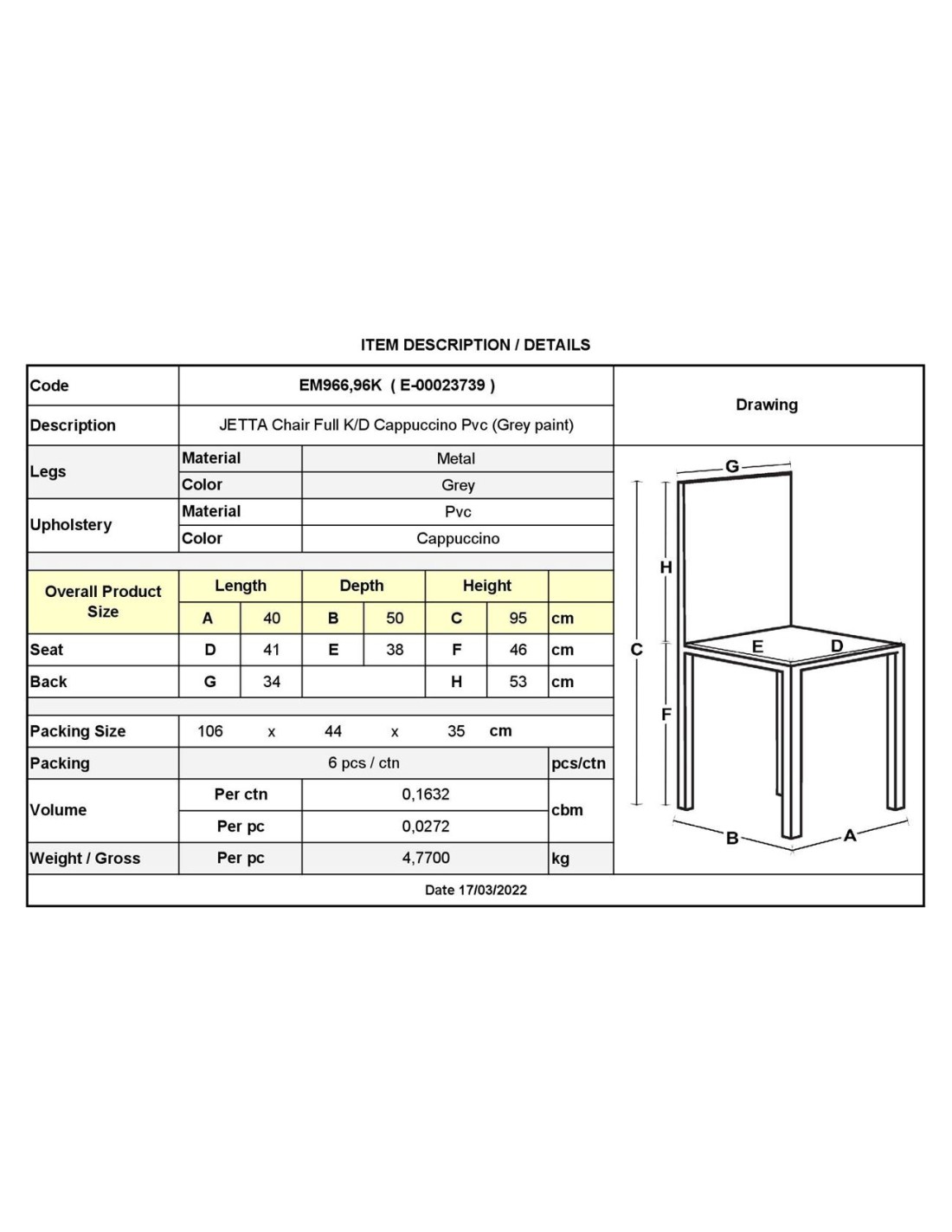 JETTA Καρέκλα Τραπεζαρίας - Κουζίνας, Μέταλλο Βαφή Γκρι, Pvc Cappuccino Full K-D Συσκ.6
