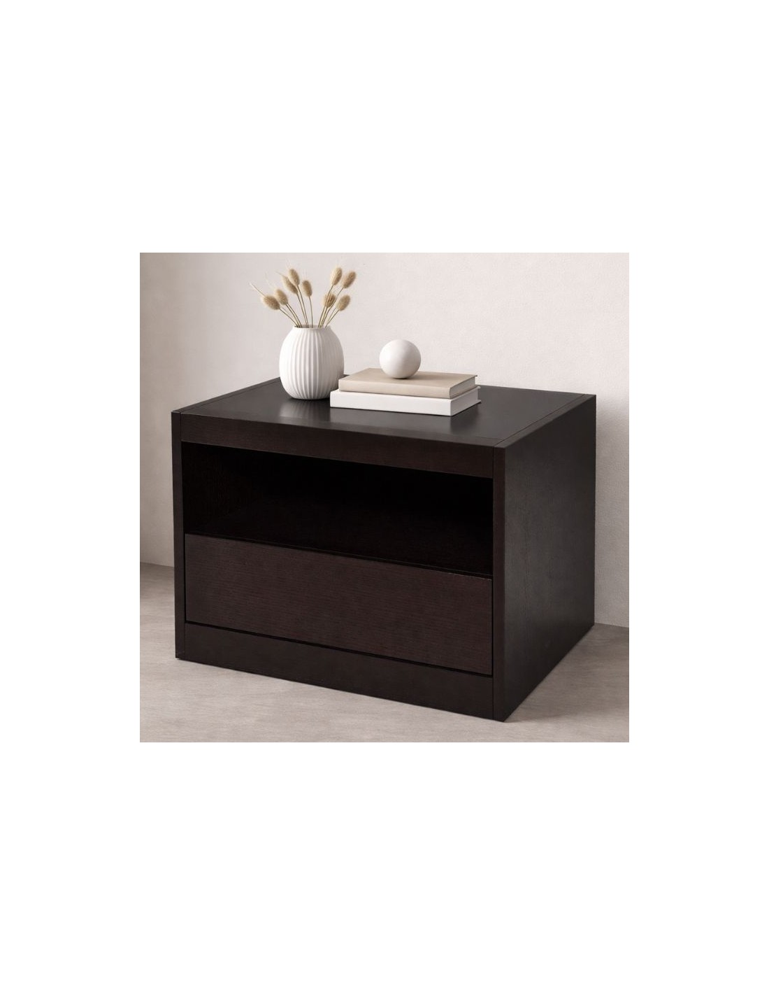 Κατασκευασμένο από ξύλο δρυ σε απόχρωση wenge, αυτό το κομοδίνο αποπνέει μια αίσθηση αριστοκρατίας με τις βαθιές αποχρώσεις και την ανθεκτική του δομή.