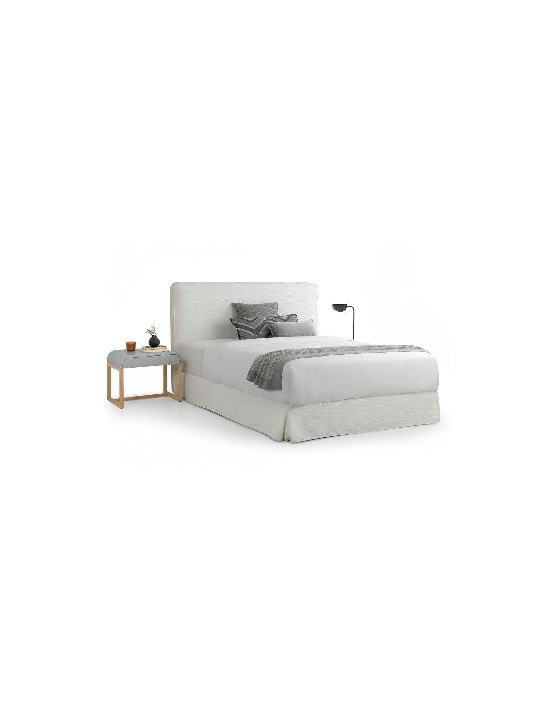 Κρεβάτι ντυμένο με ύφασμα, το οποίο υποστηρίζεται από σανίδες ή πλαίσιο βάσης στήριξης.