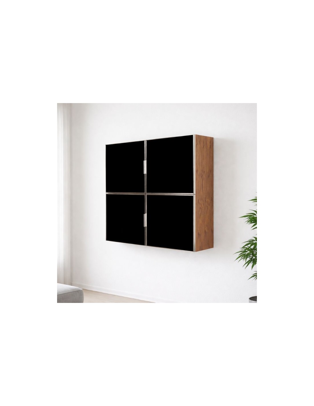Βιτρίνα από καρυδιά με 4 πόρτες από μαύρο τζάμι tempered και inox ματ πλαίσιο.