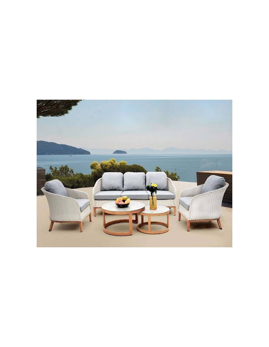 IBIZA Set Σαλόνι Κήπου: 3θέσιο +2 Πολυθρόνες+2 Τραπεζάκια ALU Φυσικό-Wicker Άσπρο-Μαξιλ.Γκρι