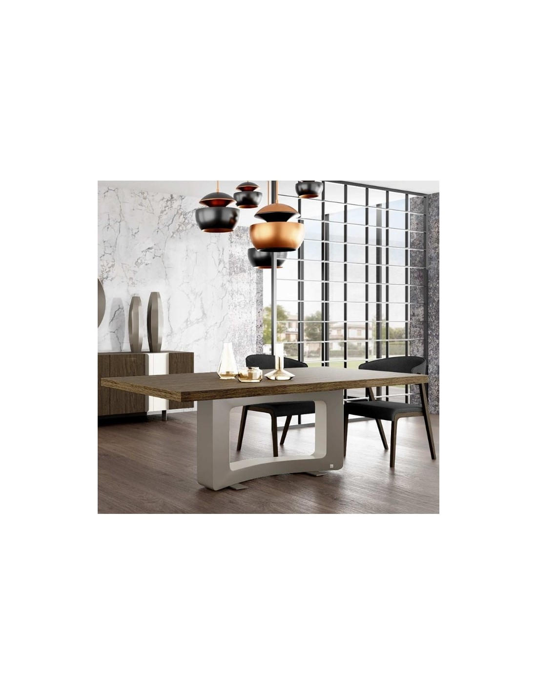 Τραπεζαρία με ημικυκλική βάση ιδιαίτερου σχεδιασμού σε δύο χρώματα λάκας που μπορεί να συνδυαστεί με καρέκλα σε μοντέρνο ή πιο κλασσικό στυλ.
