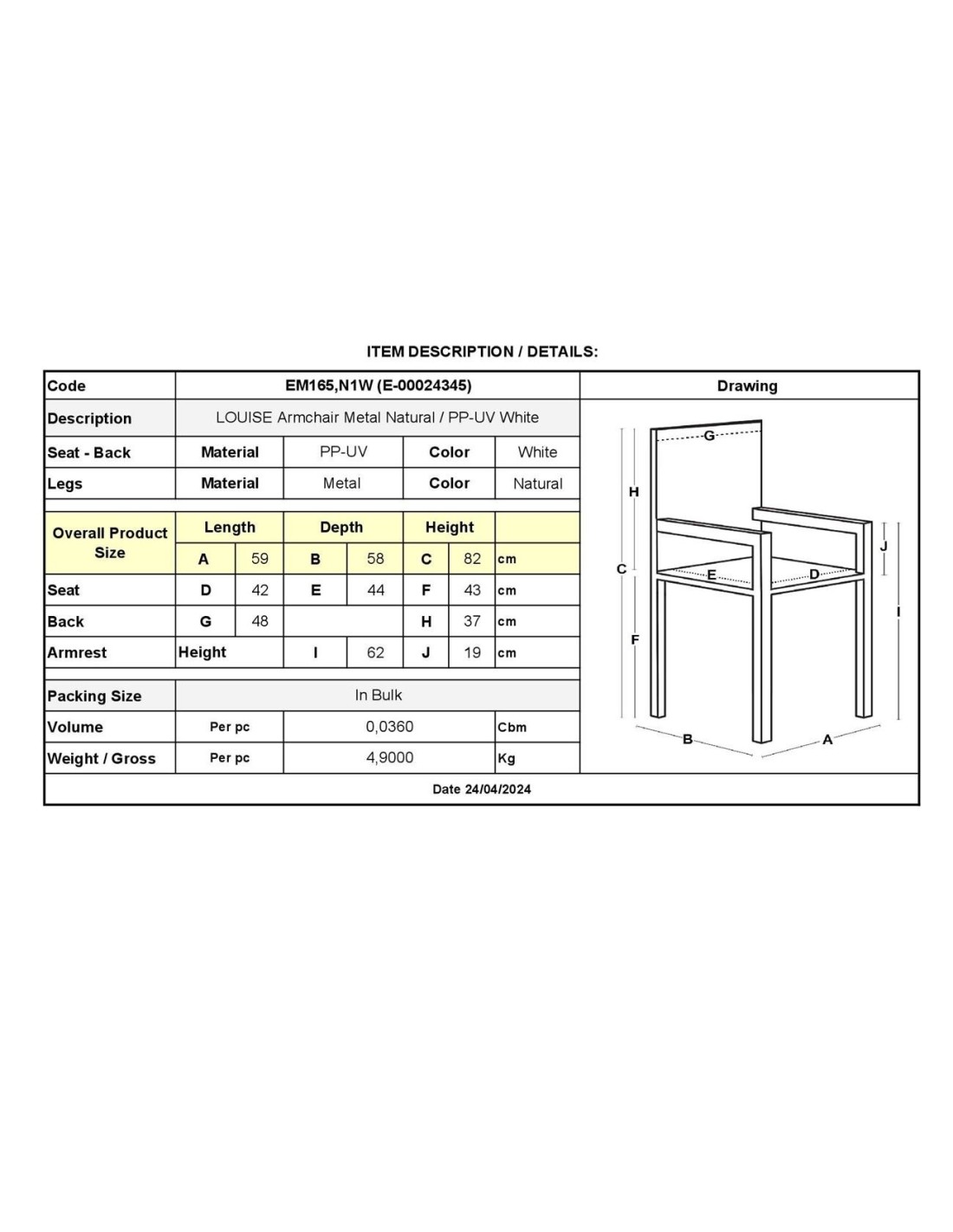 LOUISE Πολυθρόνα Μέταλλο Βαφή Φυσικό, PP-UV Άσπρο (εκτός συσκευασίας)