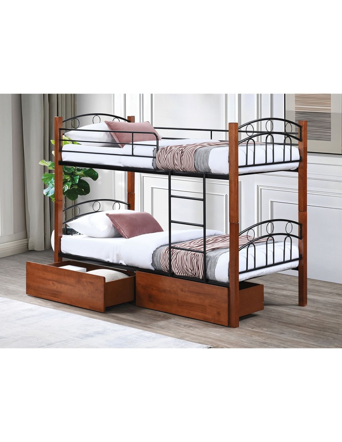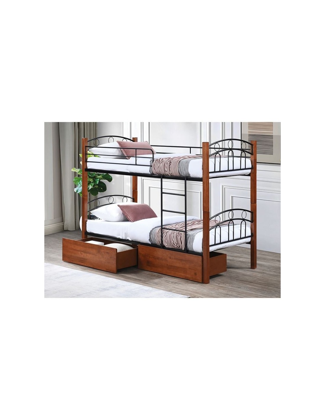 NORTON Κρεβάτι Κουκέτα με 2 Συρτάρια 94x47x30cm, Μέταλλο Βαφή Μαύρο-Ξύλο Καρυδί