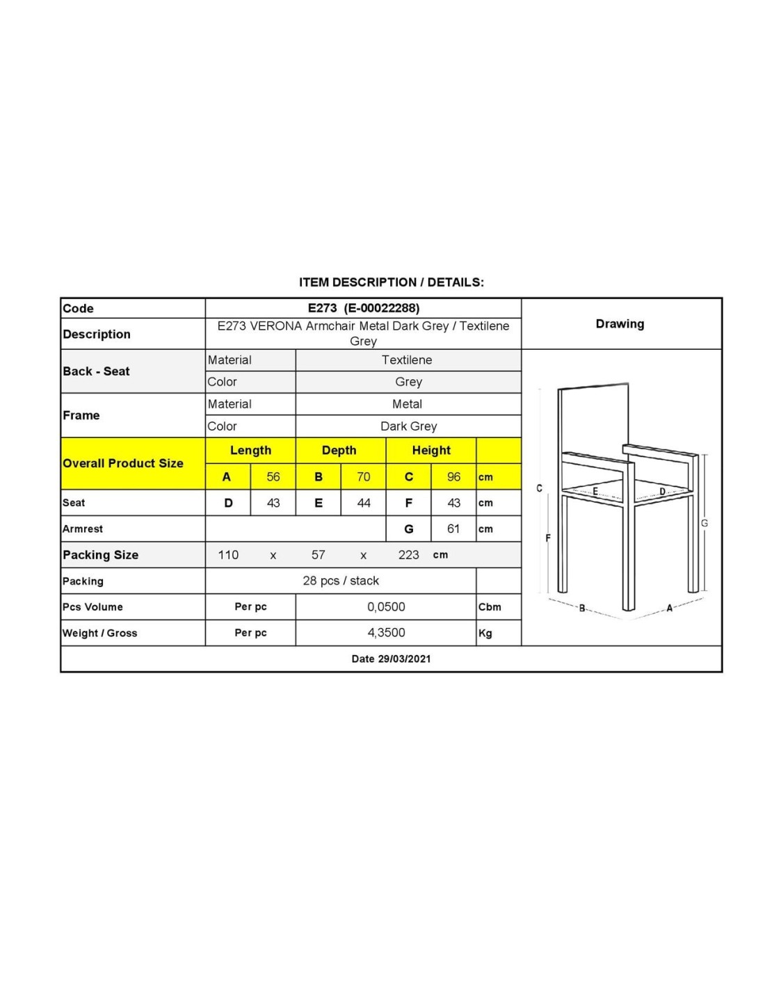 VERONA Dining Πολυθρόνα Κήπου - Βεράντας, Μέταλλο Βαφή Ανθρακί, Textilene Γκρι
