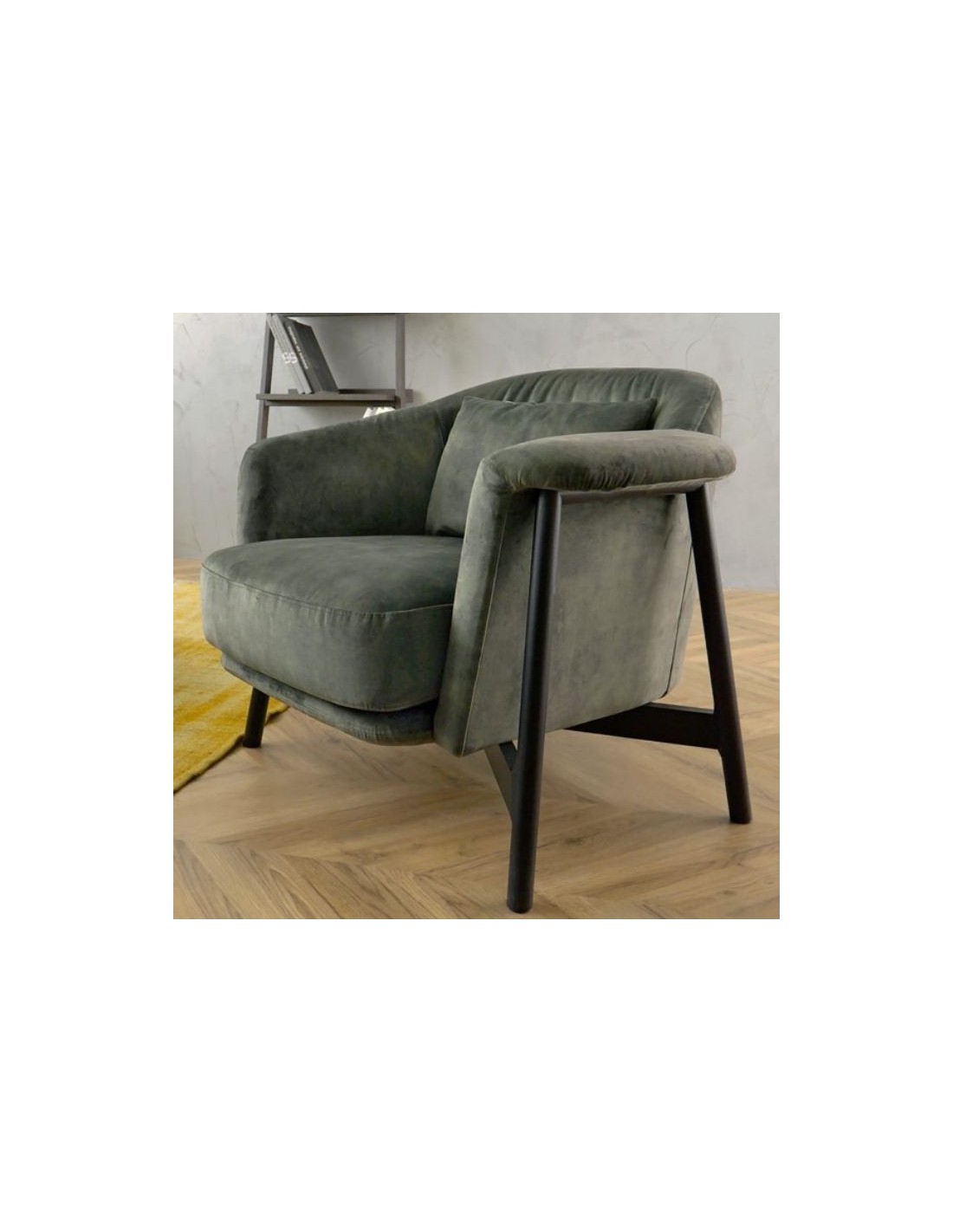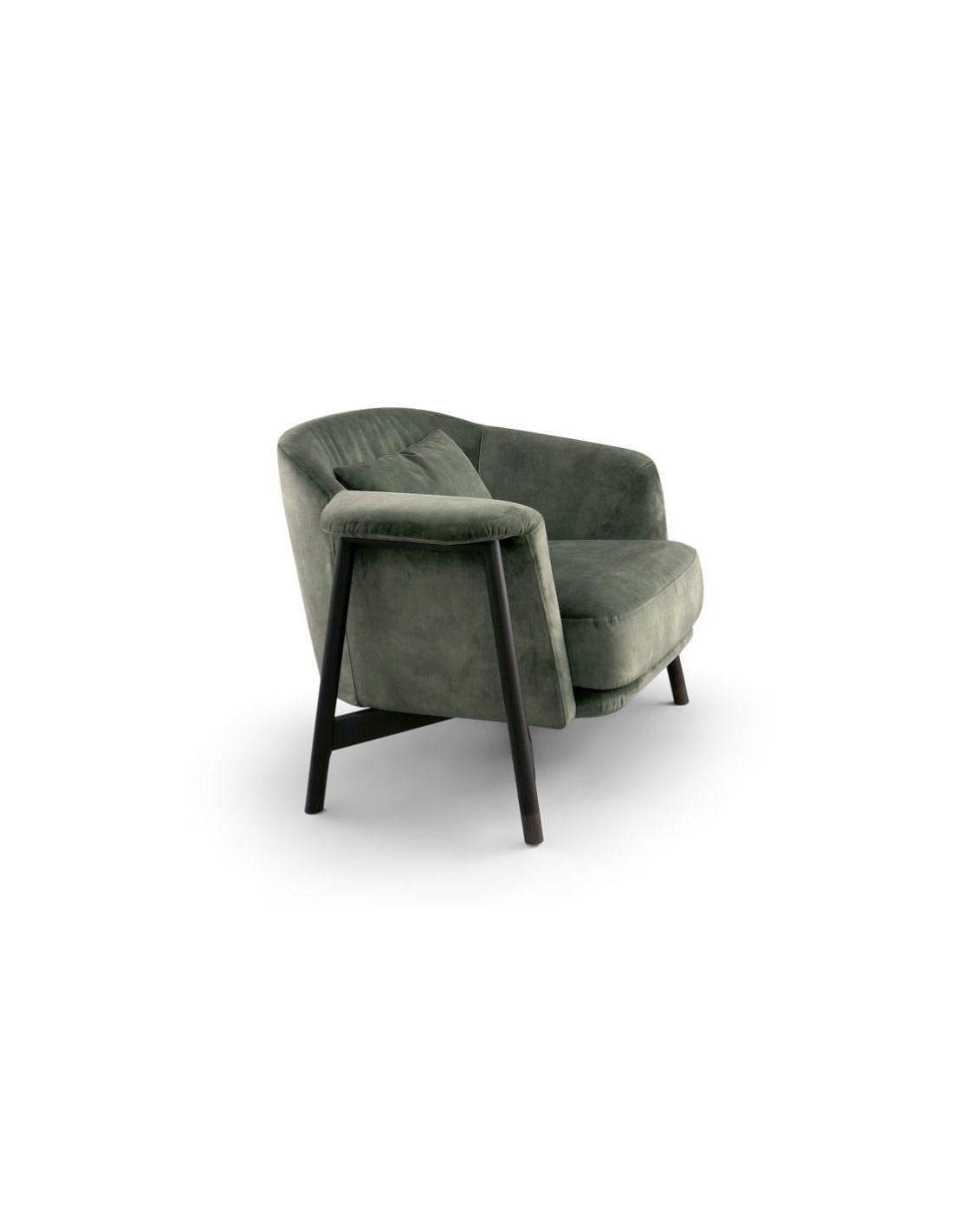 Armchair with wooden or metal base. The upholstery is available in a variety of textiles and colors.