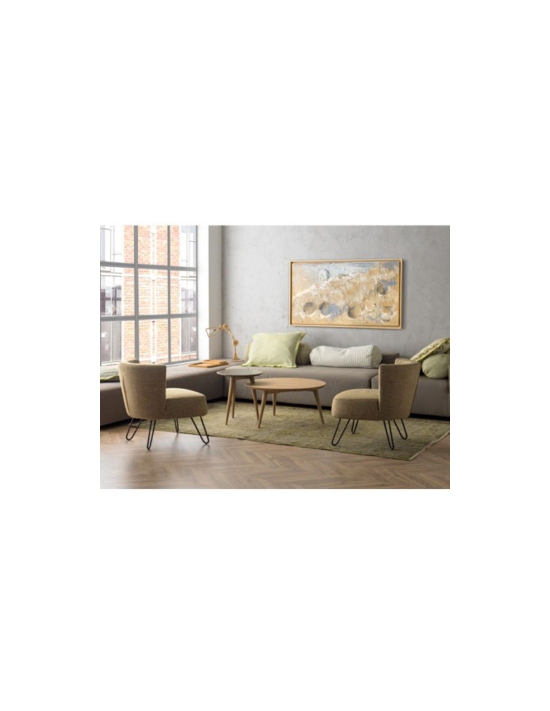 Small armchair with metal or wooden base. The upholstery is available in a variety of textiles and colors.