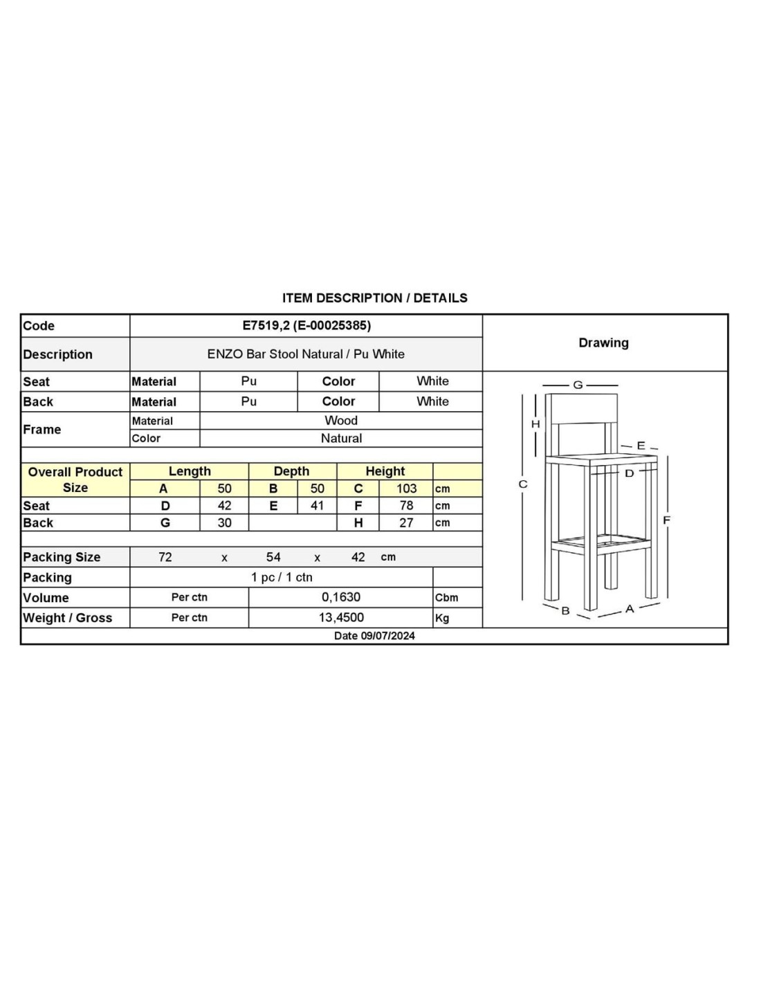 ENZO Bar Stool Natural-Pu White