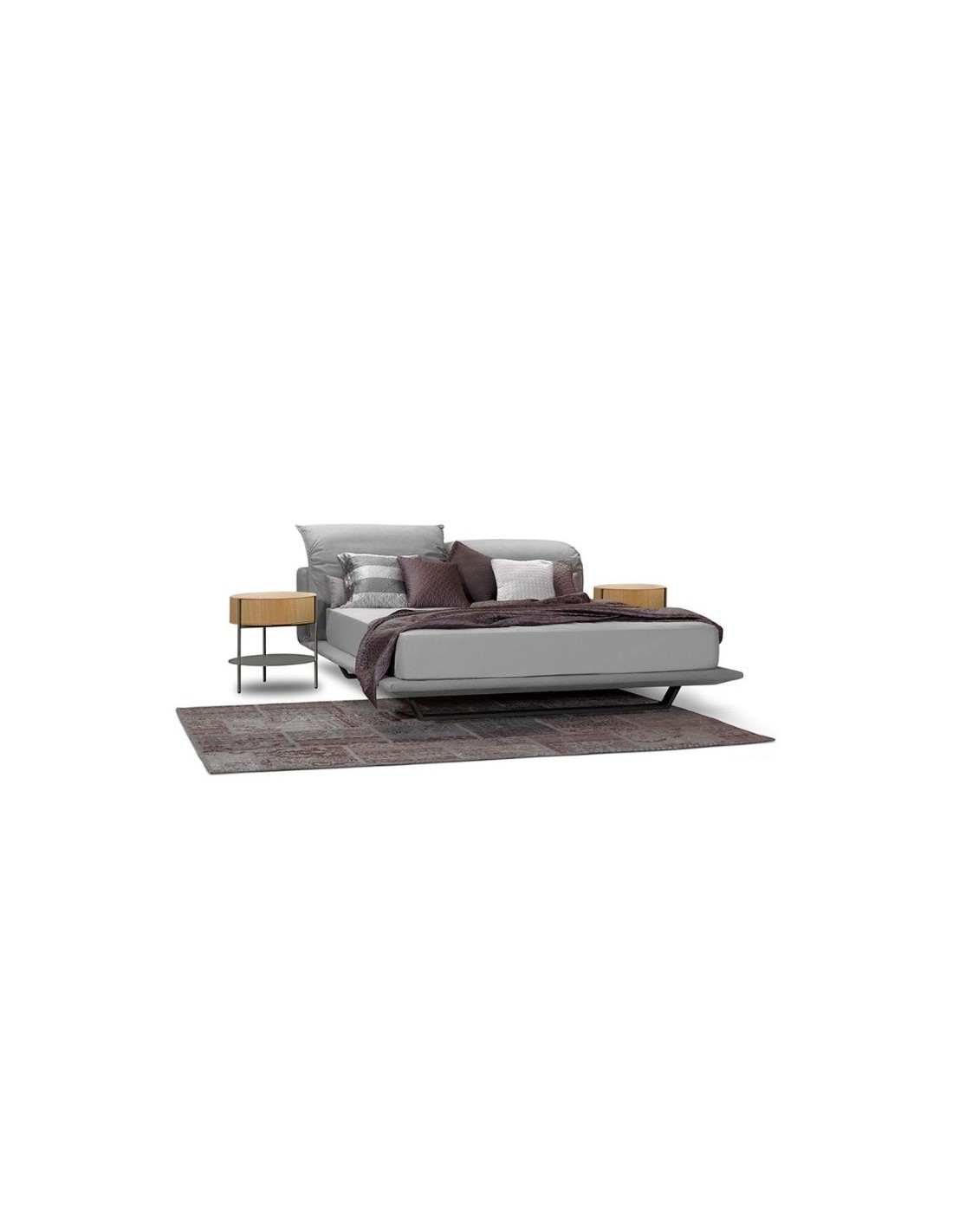 Fabric bed with a distinctive thin base and tilting headers in a wide variety of colors and fabrics.