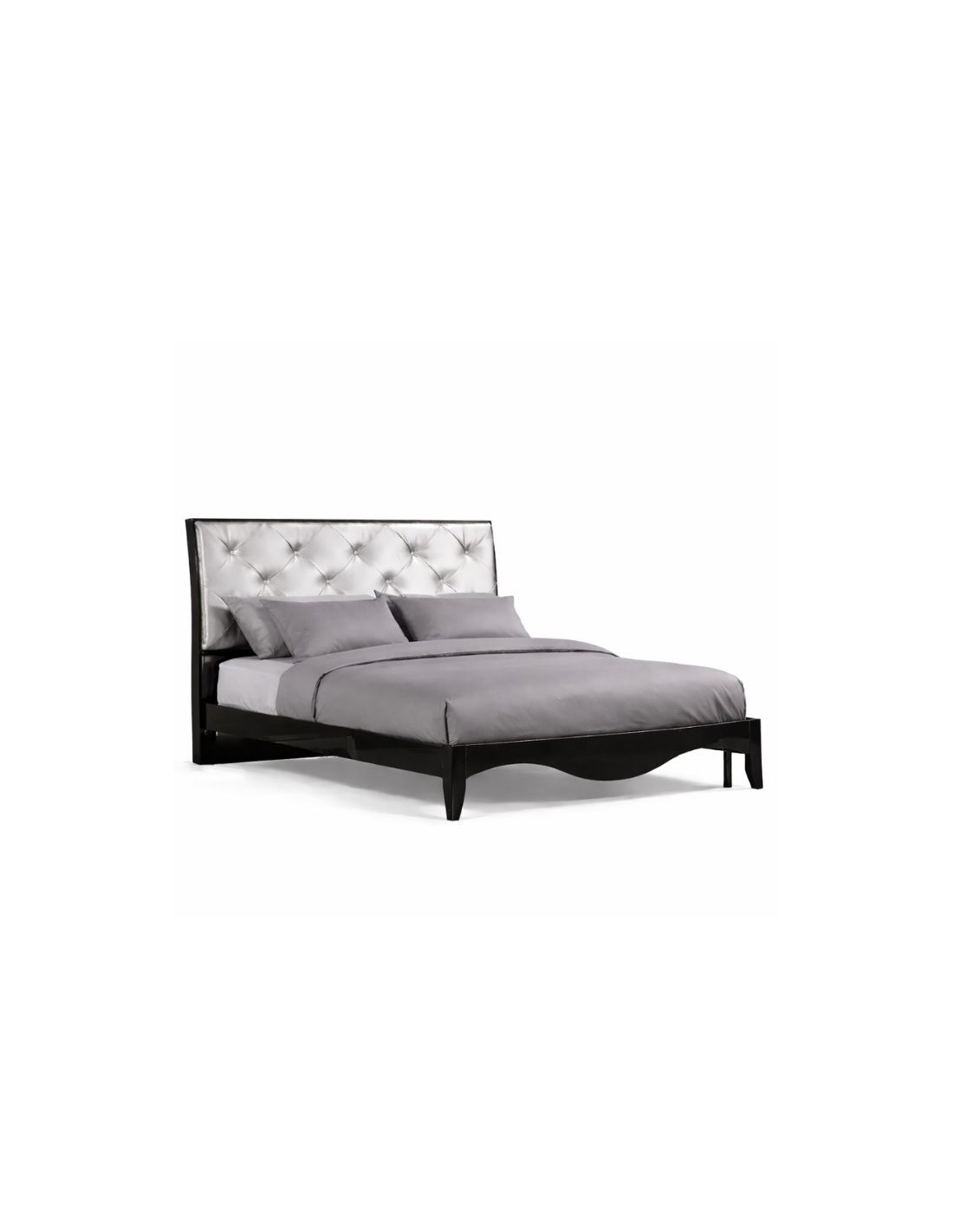 The bed’s headboard is upholstered in silver leatherette with a tufted design, featuring transparent buttons that resemble crystals, adding a touch of elegance to your space.