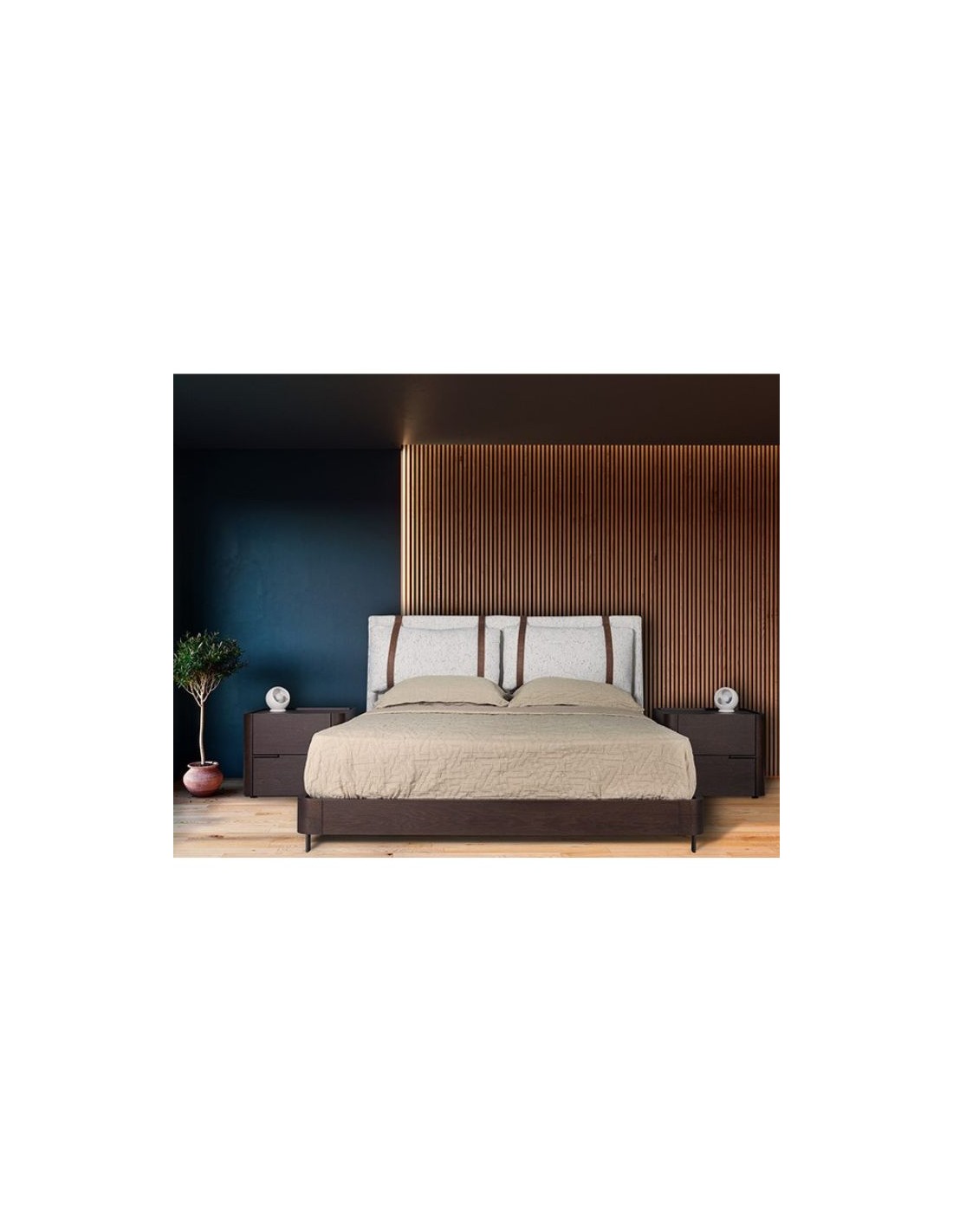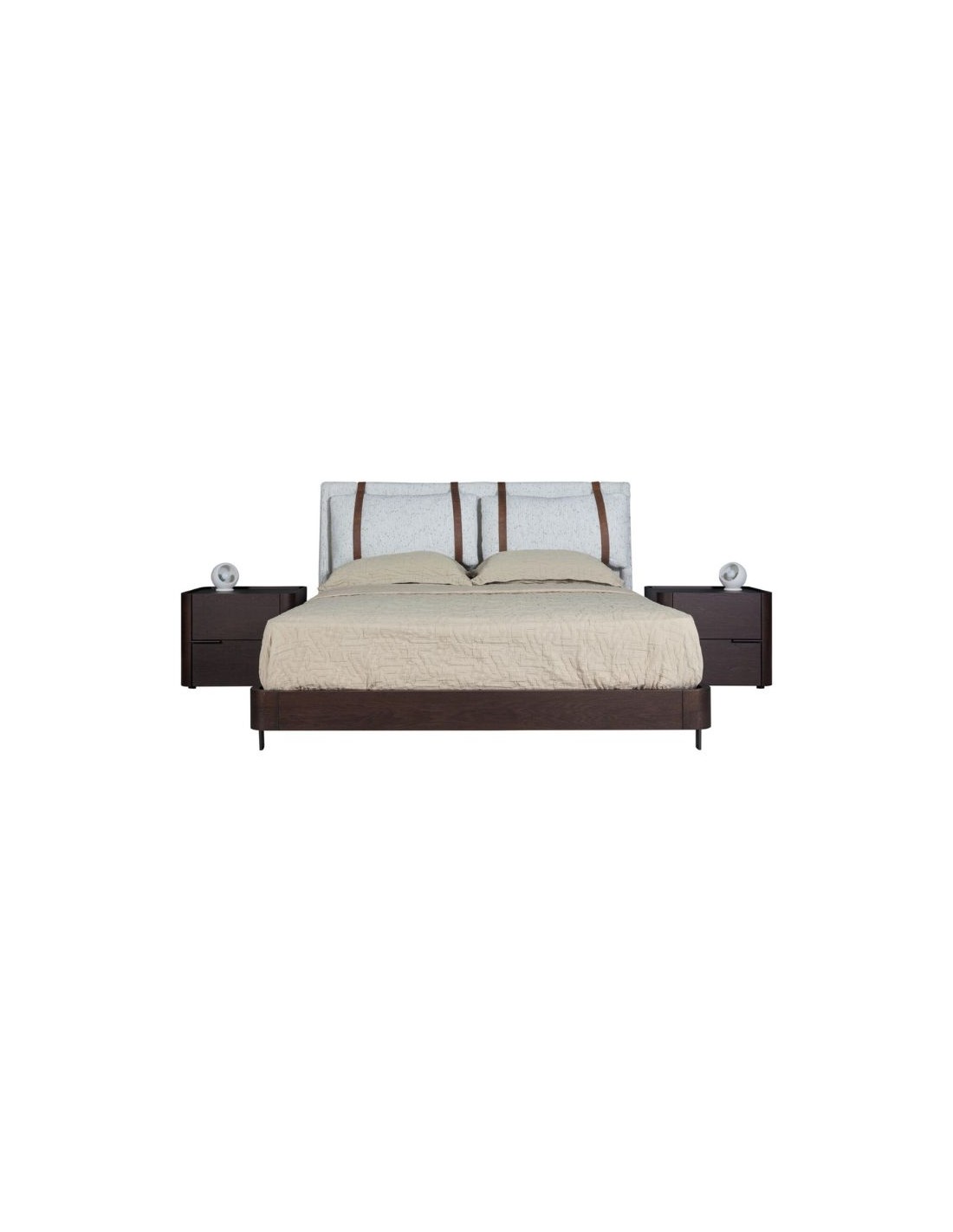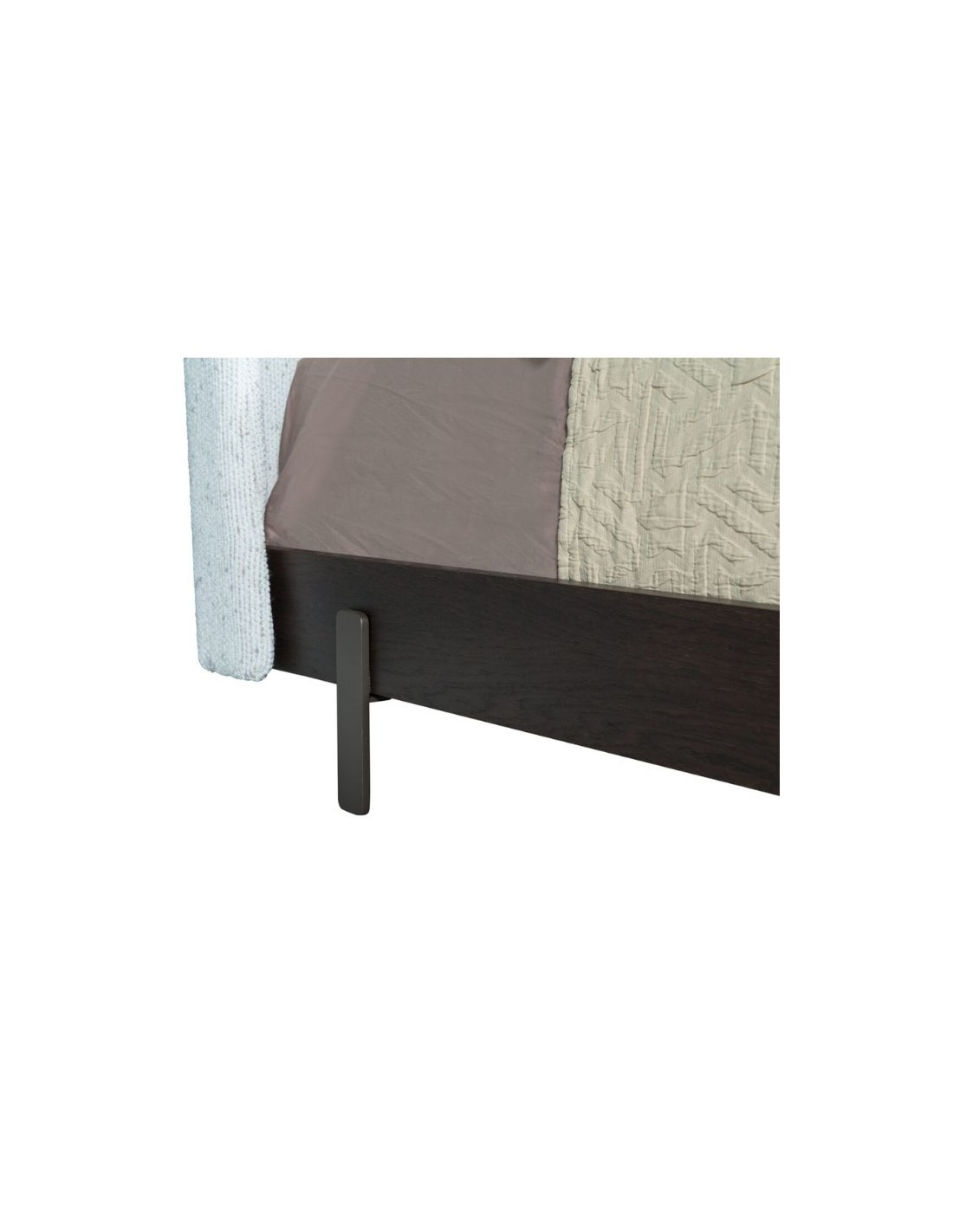 Bed with fabric headboard and wooden frame in veneer or lacquer with metal legs.