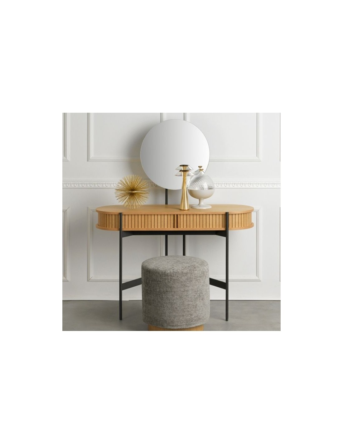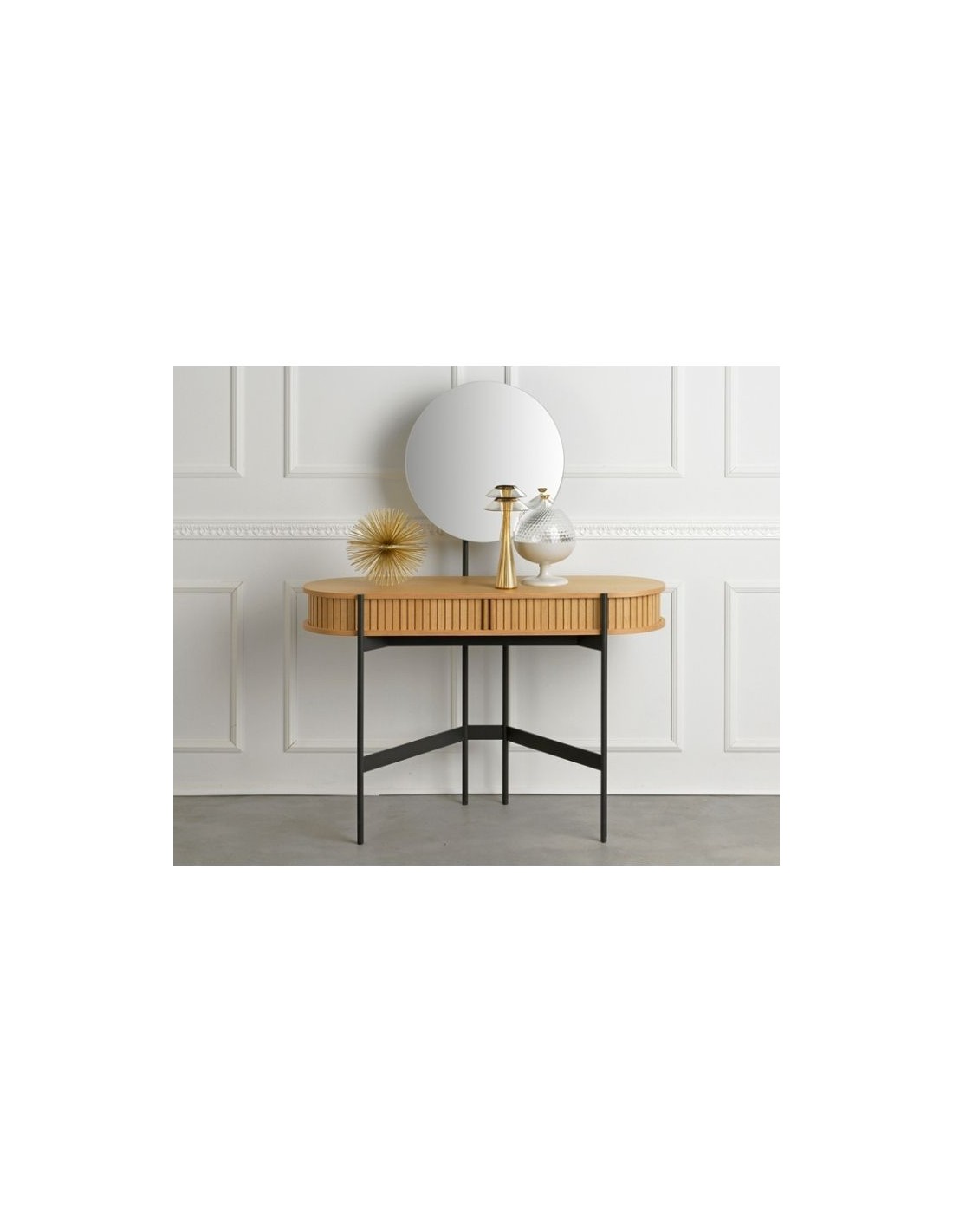 Rafaello chest of drawer with wooden drawer with sliding roller, metal base and mirror.