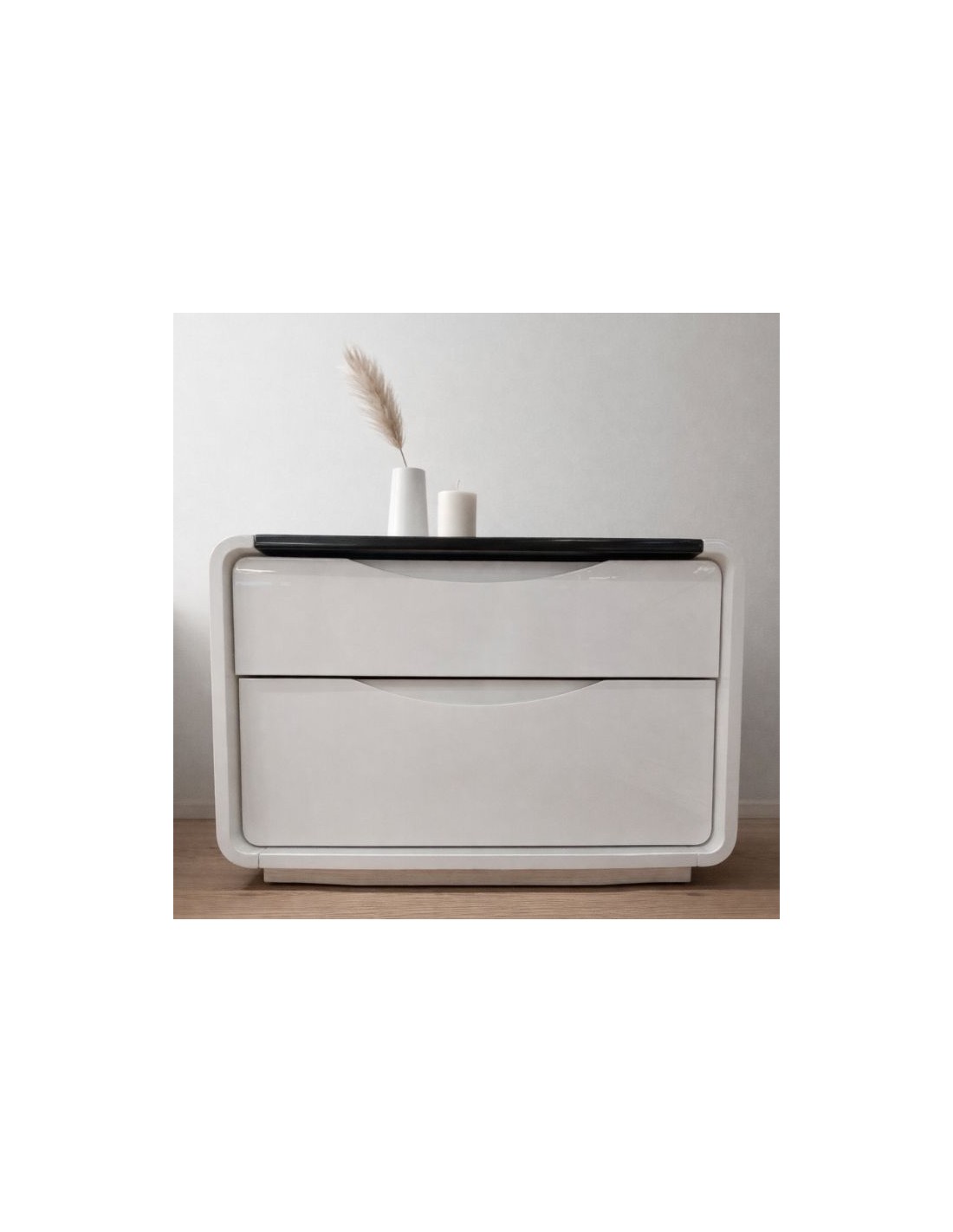 With a modern aesthetic that reflects luxury and elegance, this bedside table offers a smooth surface made of black glass that harmoniously combines with the white lacquer of the rest of the furniture.