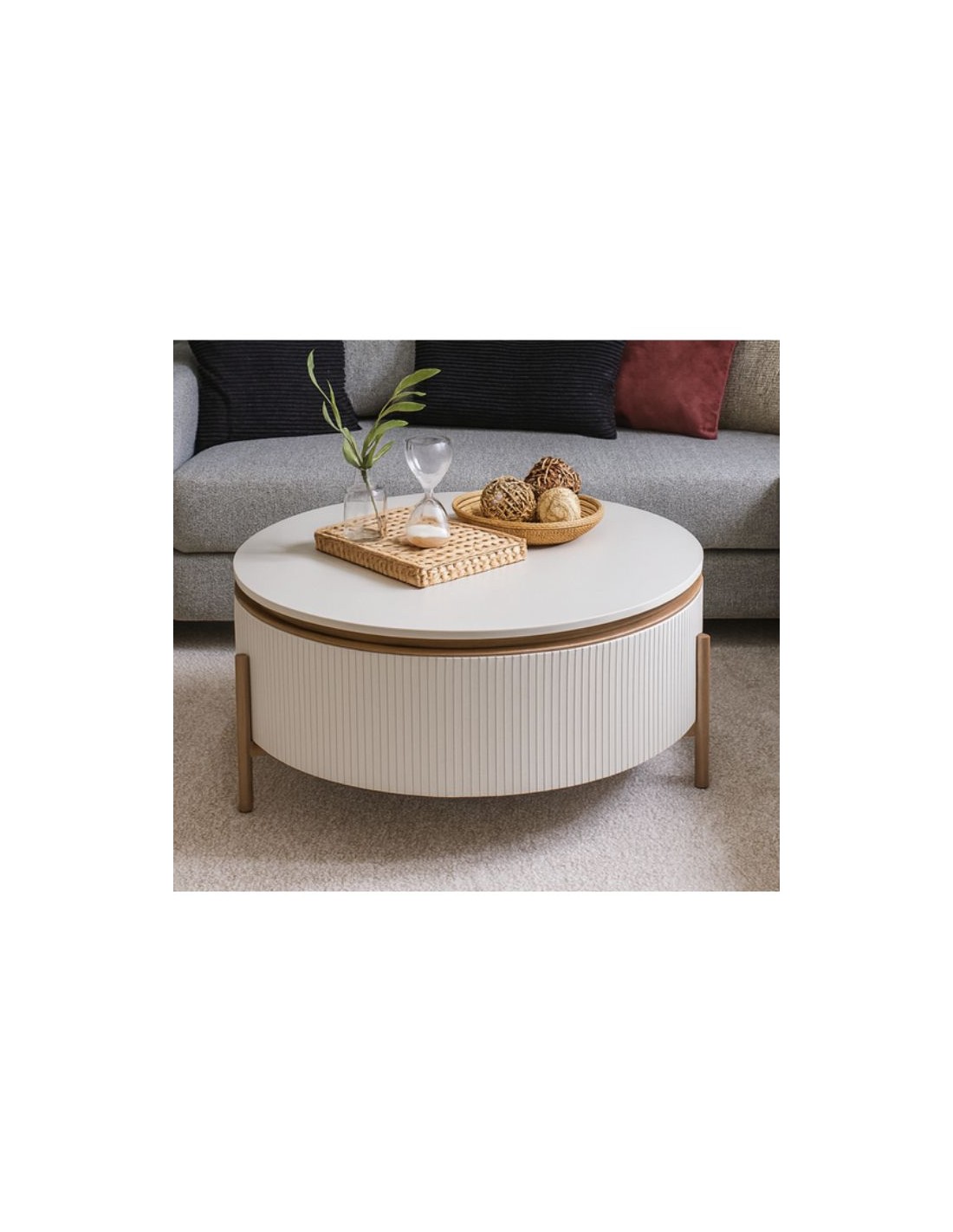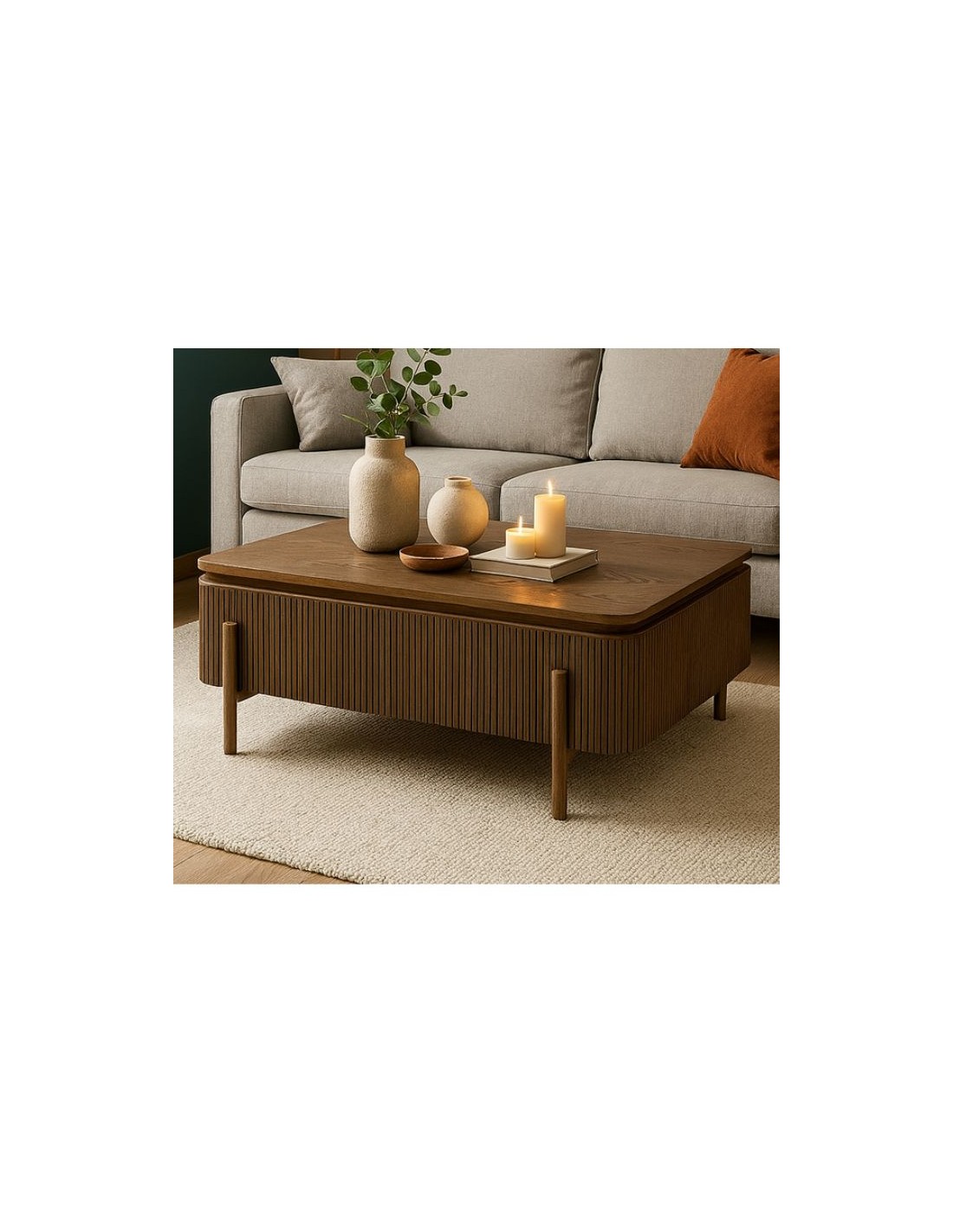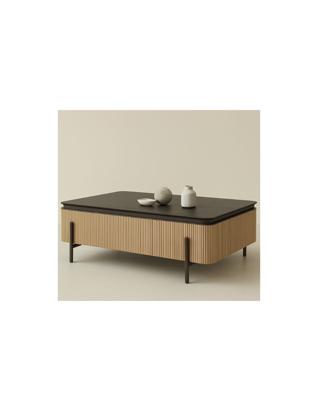 Minimal coffee table with clean lines and elegant vertical detailing, set in a modern environment with subtle décor that enhances its contemporary design.