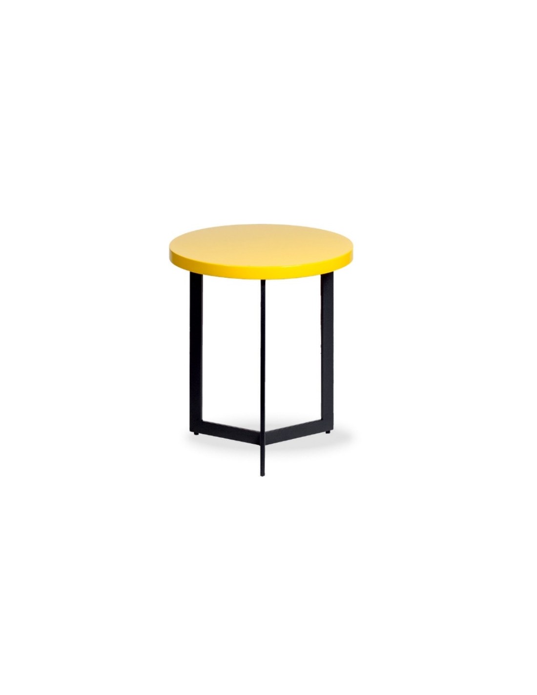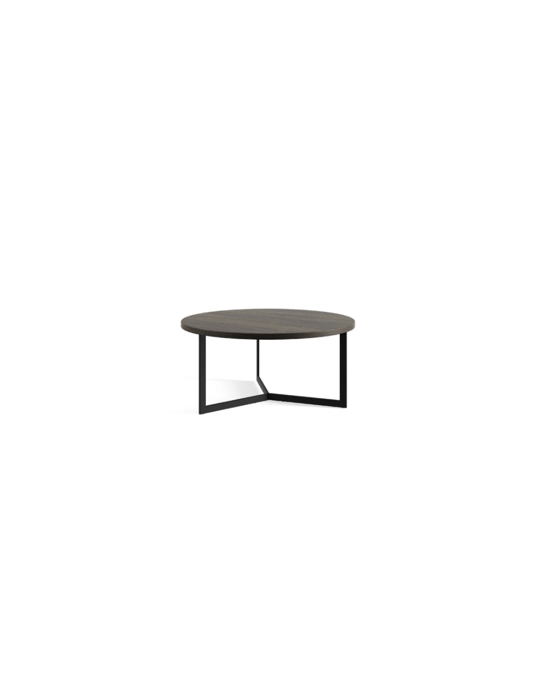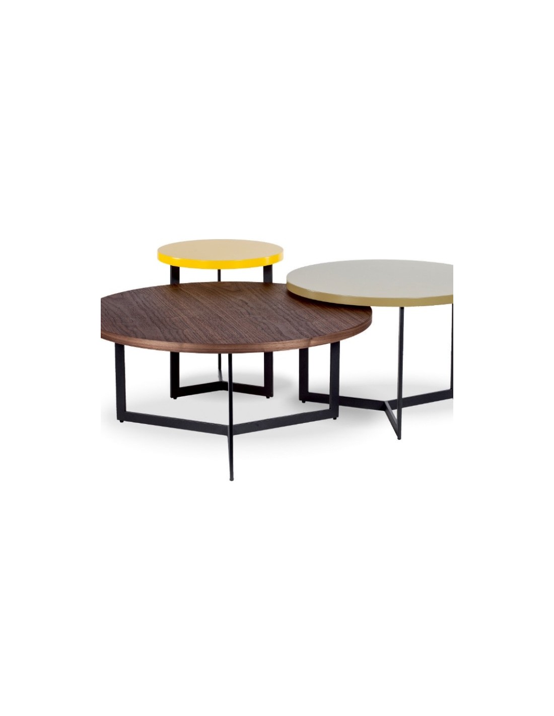 Round coffee tables with triptych metallic base. Available in various surfaces.