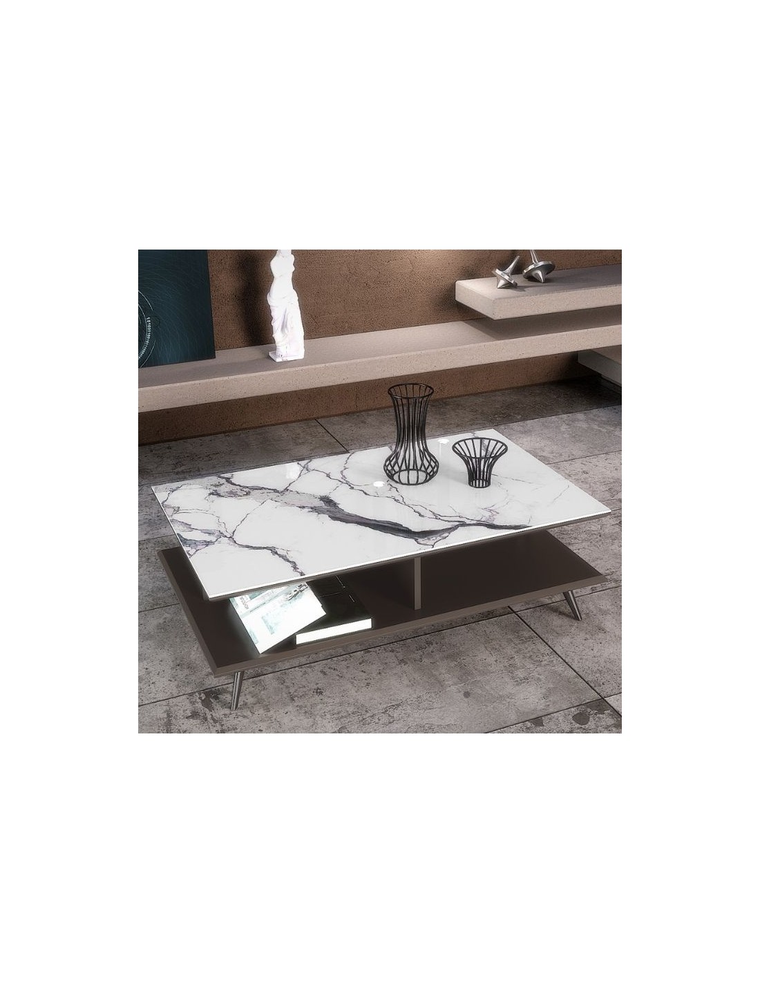 A unique coffee table with ceramic surface on the top, storage space with symmetries and elegant metal legs.
