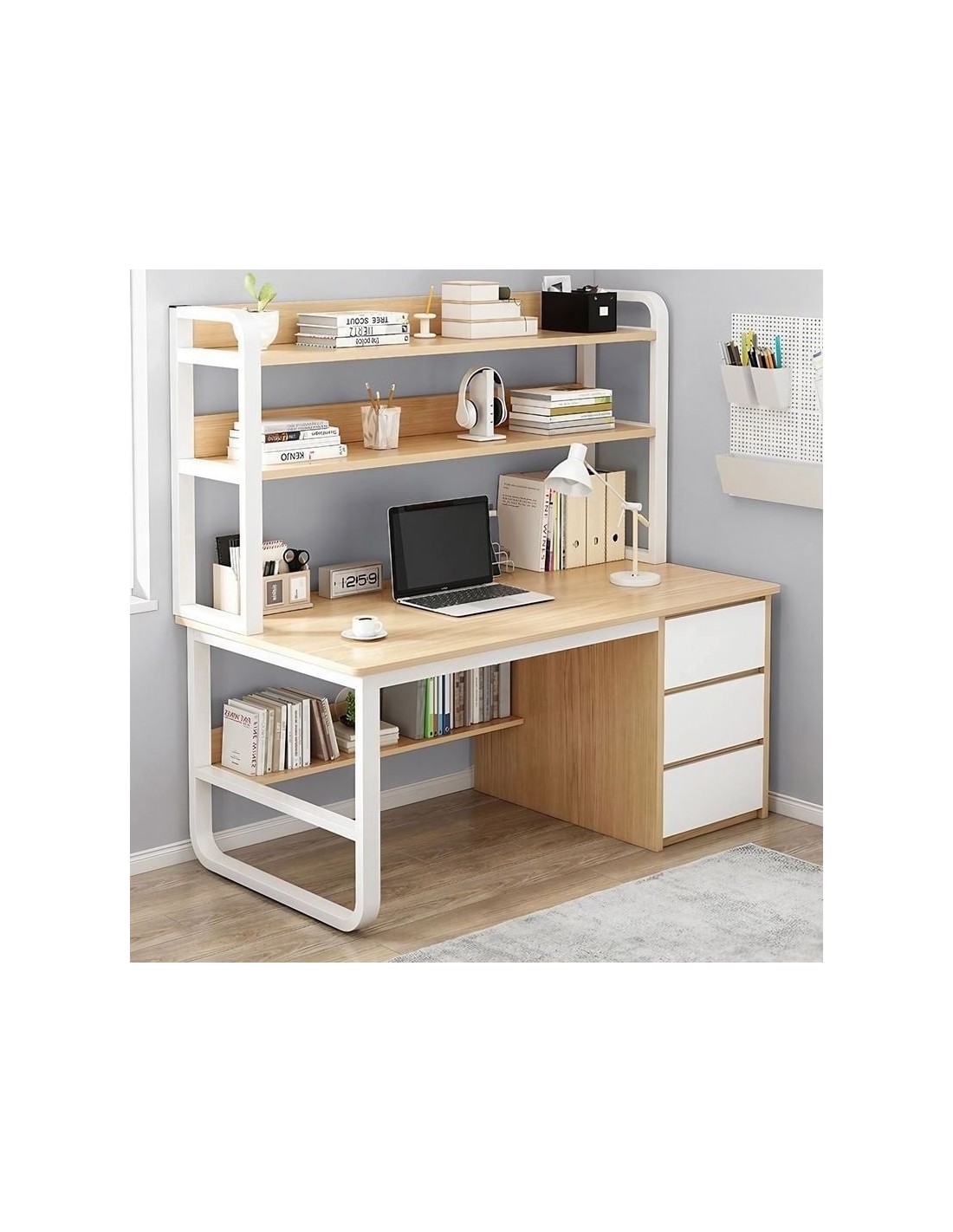 PC Metal Desk 3 Drawers-3 Shelves 120x50x74-147cm White-Natural