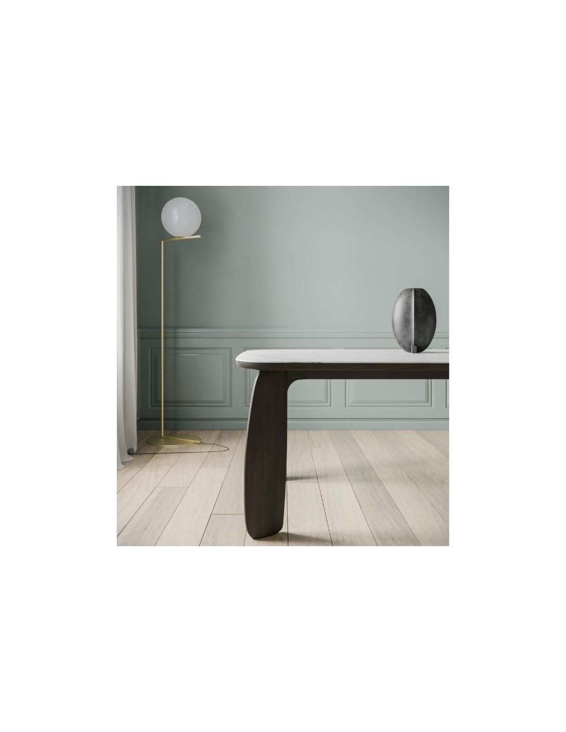 Table with massif wooden legs and n Isola-type surface, available with or without extension.
