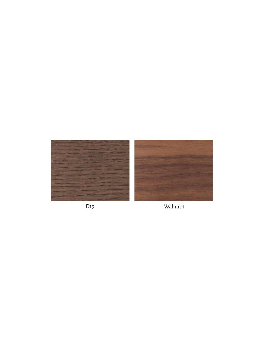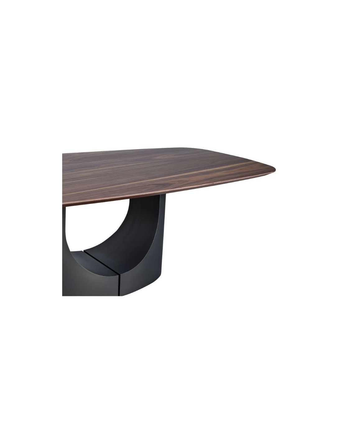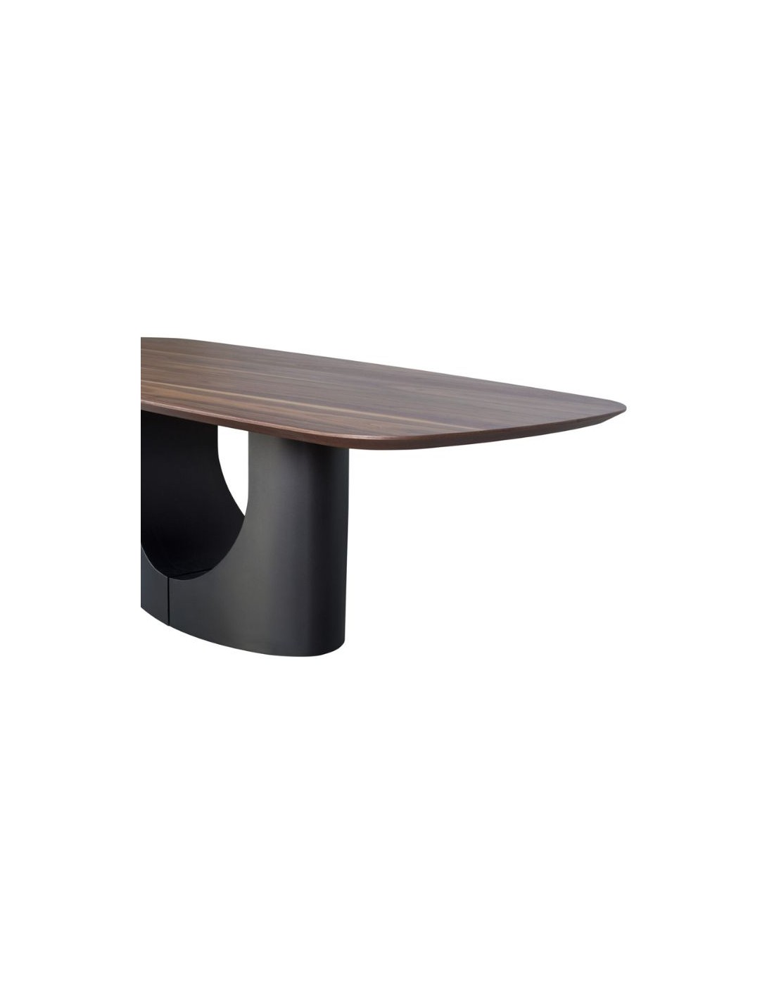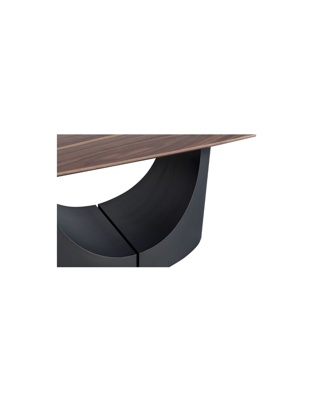 The Smile DS 001 dining table table with oval thin edge top in veneer wood with diagonal veins and metal base.