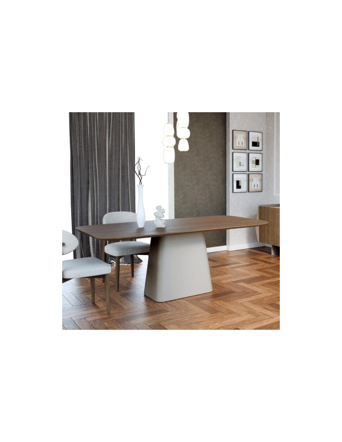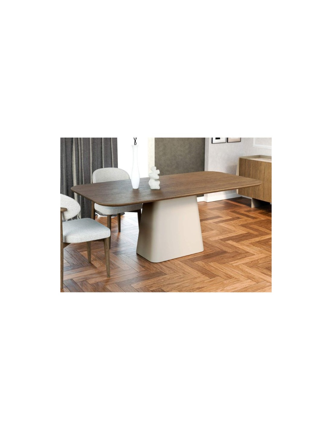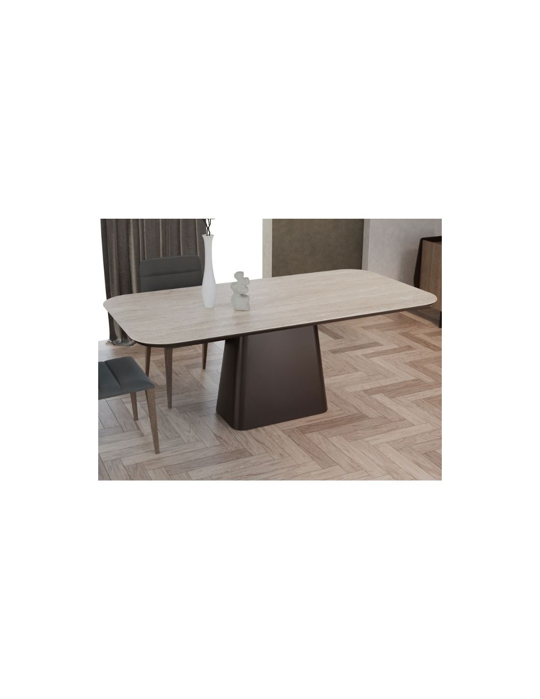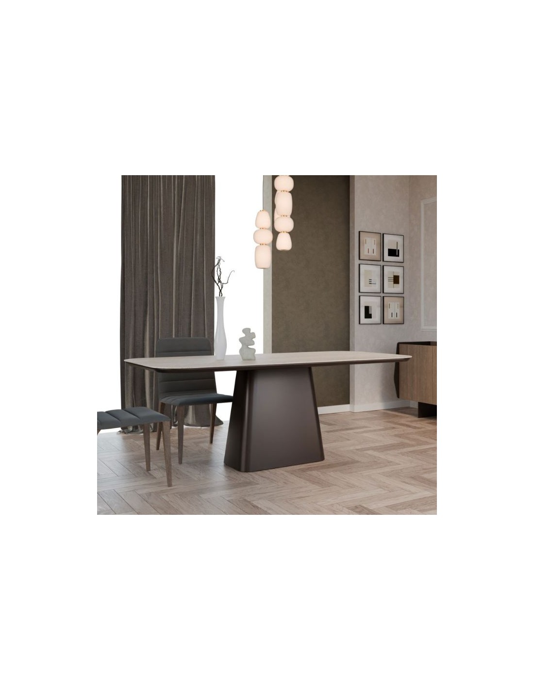 Elegant dining table with a contemporary design, featuring a striking tabletop and a solid central base.