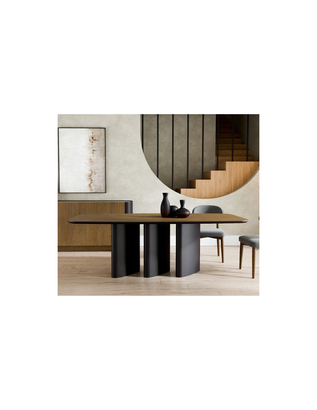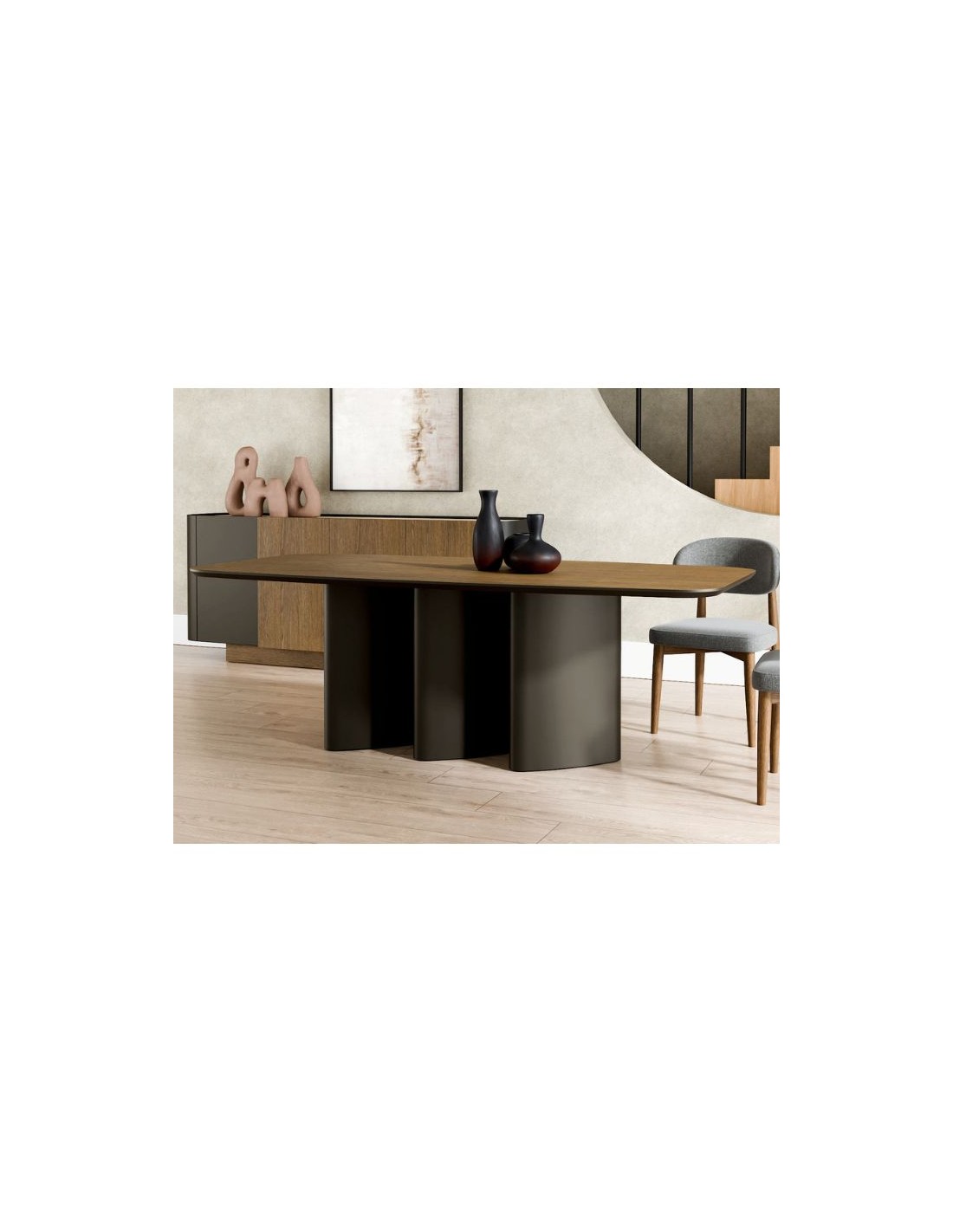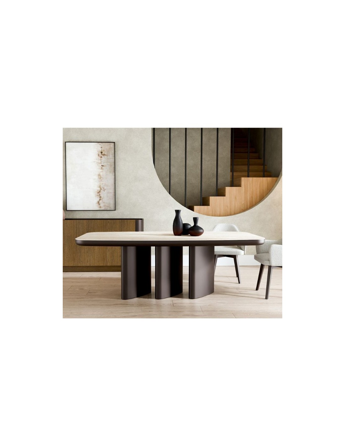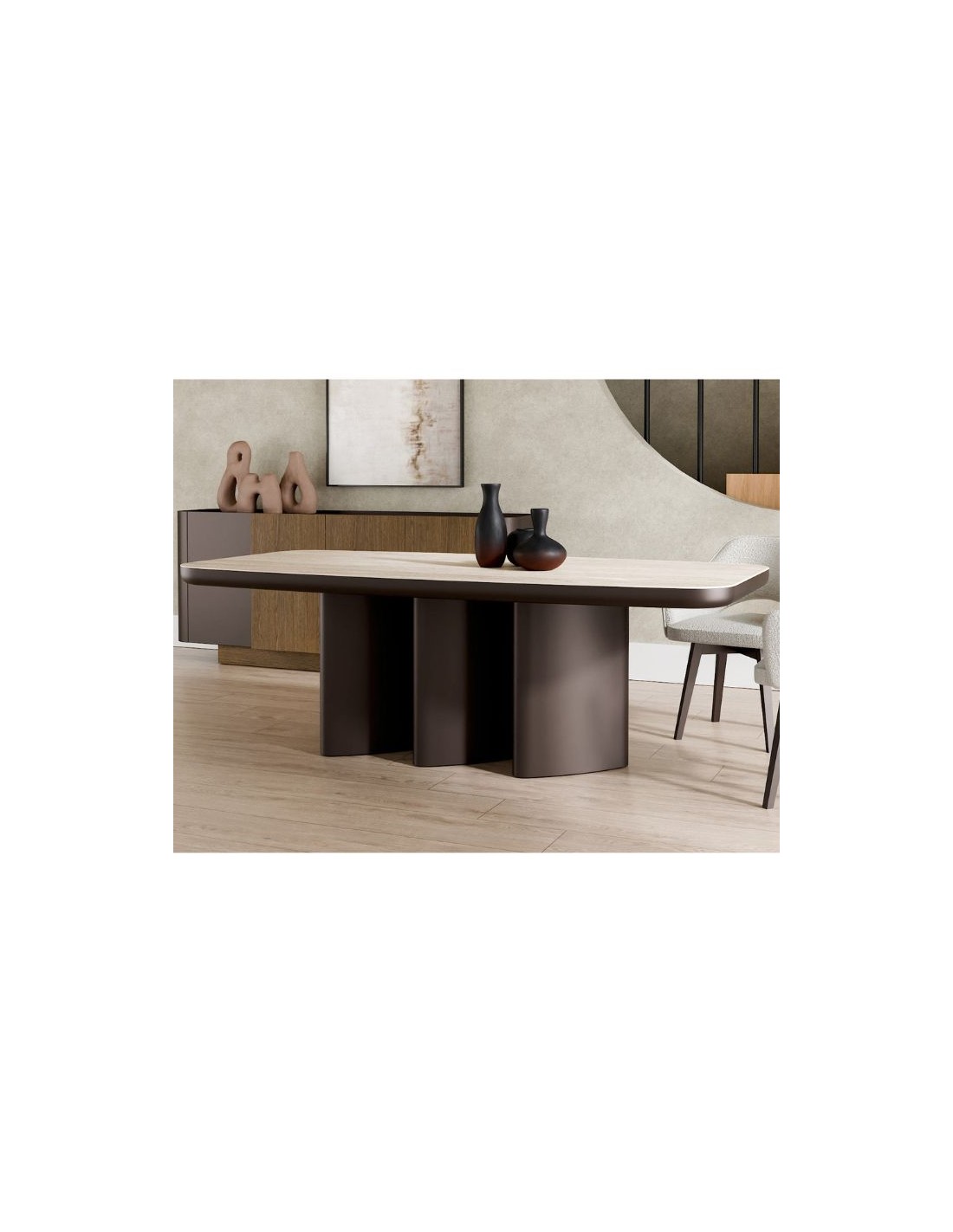 Contemporary dining table with an elegant and dynamic design, distinguished by its smooth curves and solid, sculptural base.