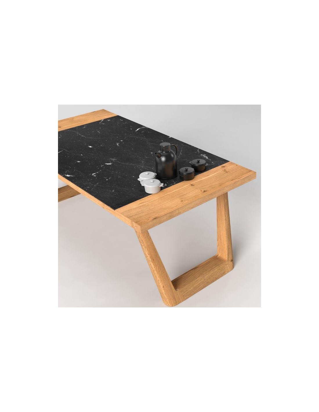 The oaken base of solid wood follows a rustic style, which is completed by the curved angles of the trapezoidal legs of the table.