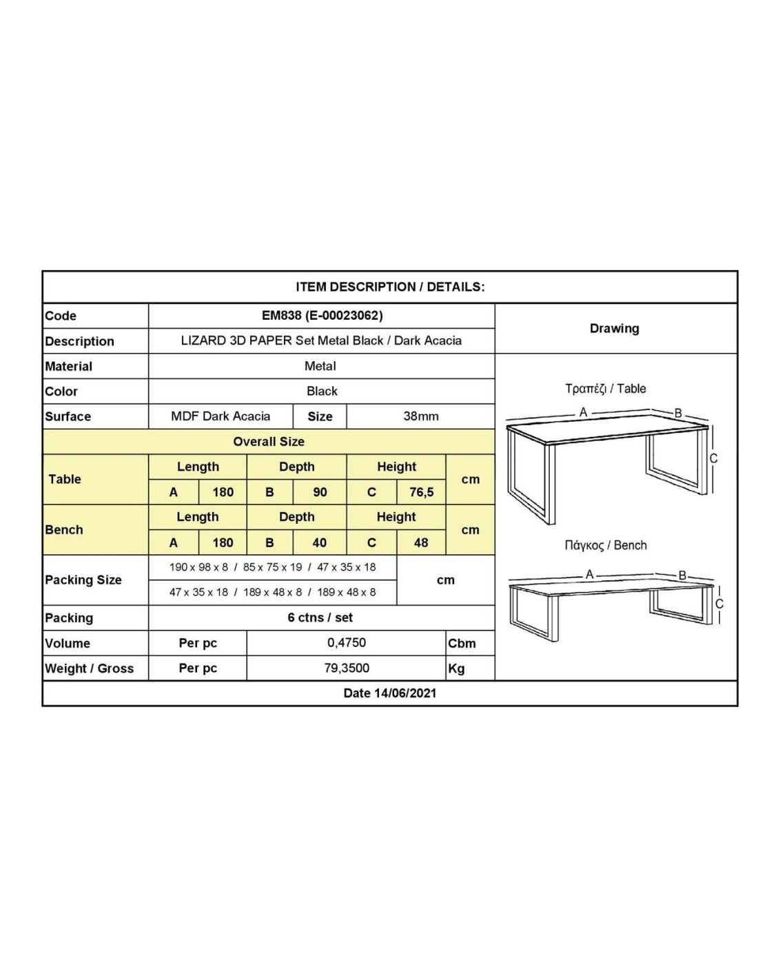LIZARD 3D PAPER Set (Table 180x90cm+2 Benches) Metal Black-Dark Acacia