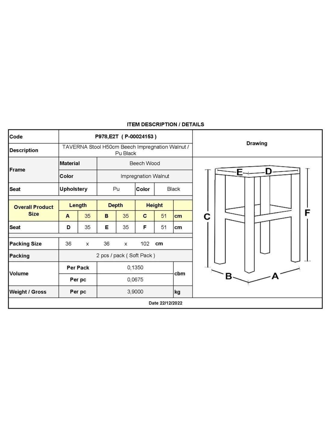 TAVERNA Stool H50cm Beech Impregnation Walnut-Pu Black
