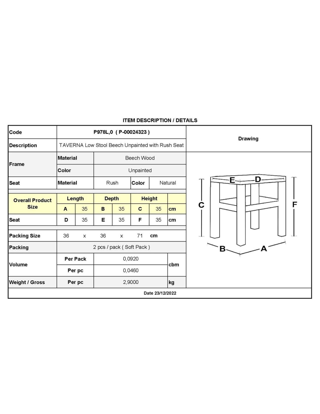 TAVERNA Low Stool H35cm Unpainted with Rush Seat