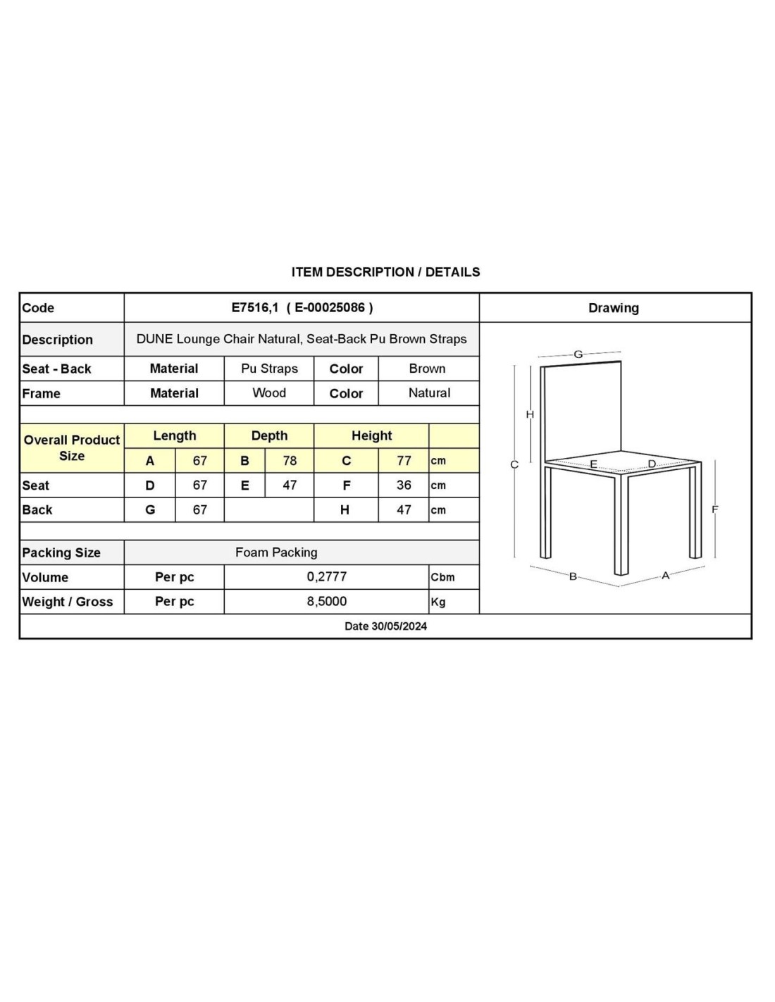 DUNE MAX Lounge Chair Natural, Seat-Back Pu Brown Straps