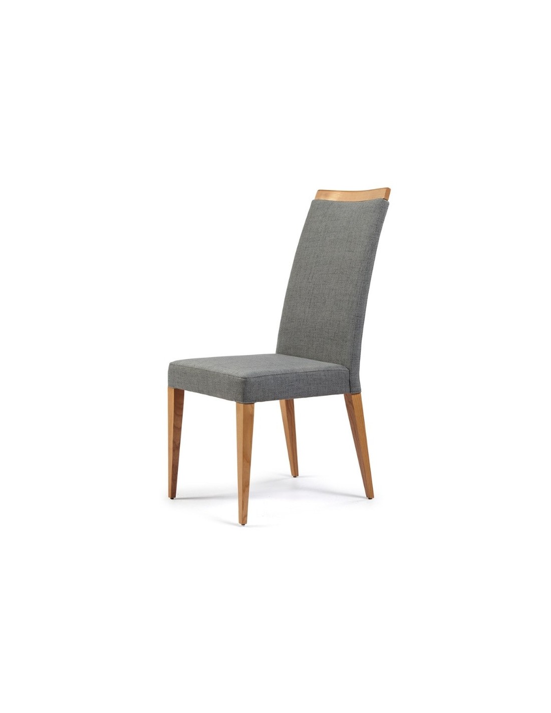 A chair upholstered with fabric and a high backrest, which is adorned with wood at its end.