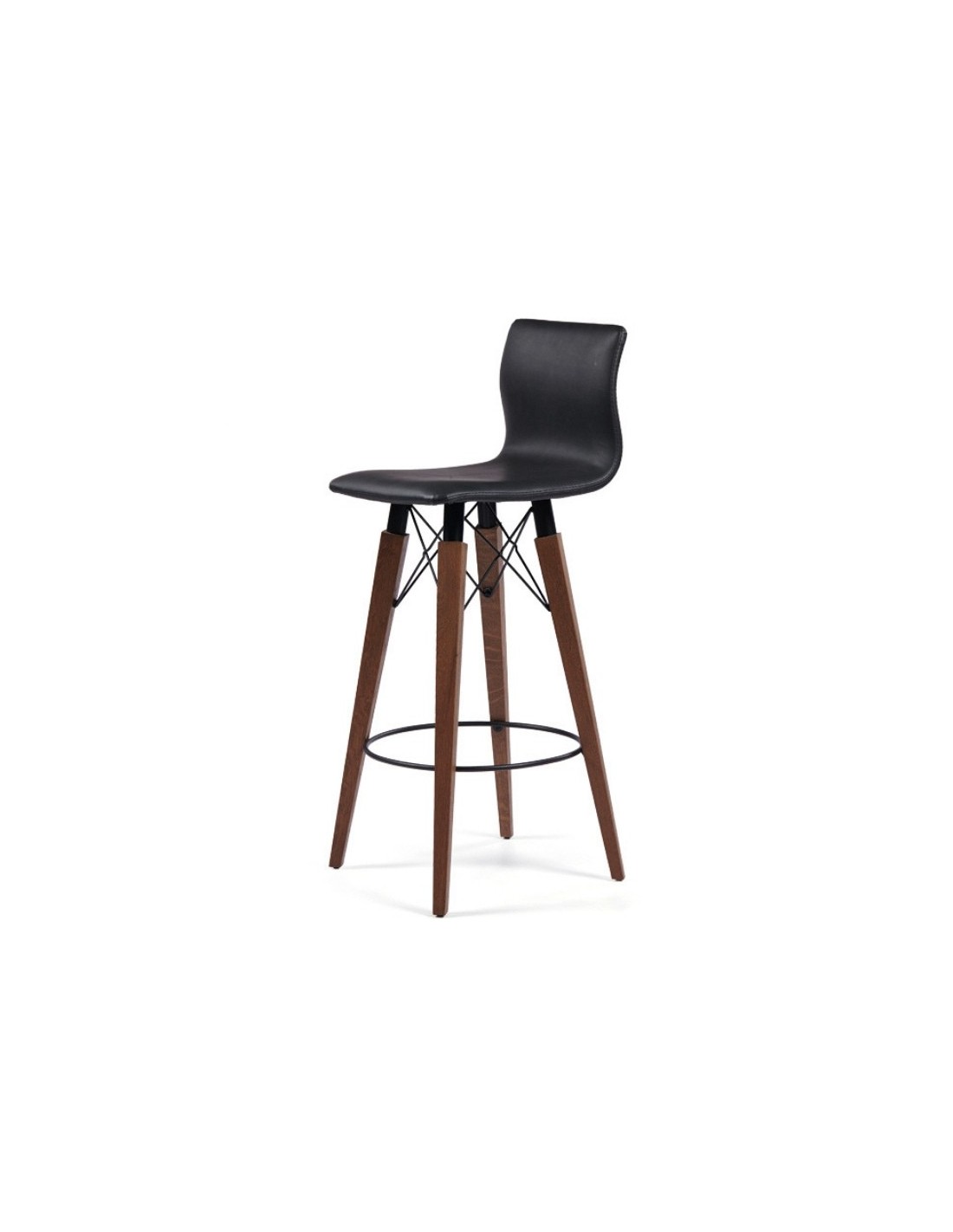 A high bar stool with a backrest and oblique supporting legs that combine metal and wood.