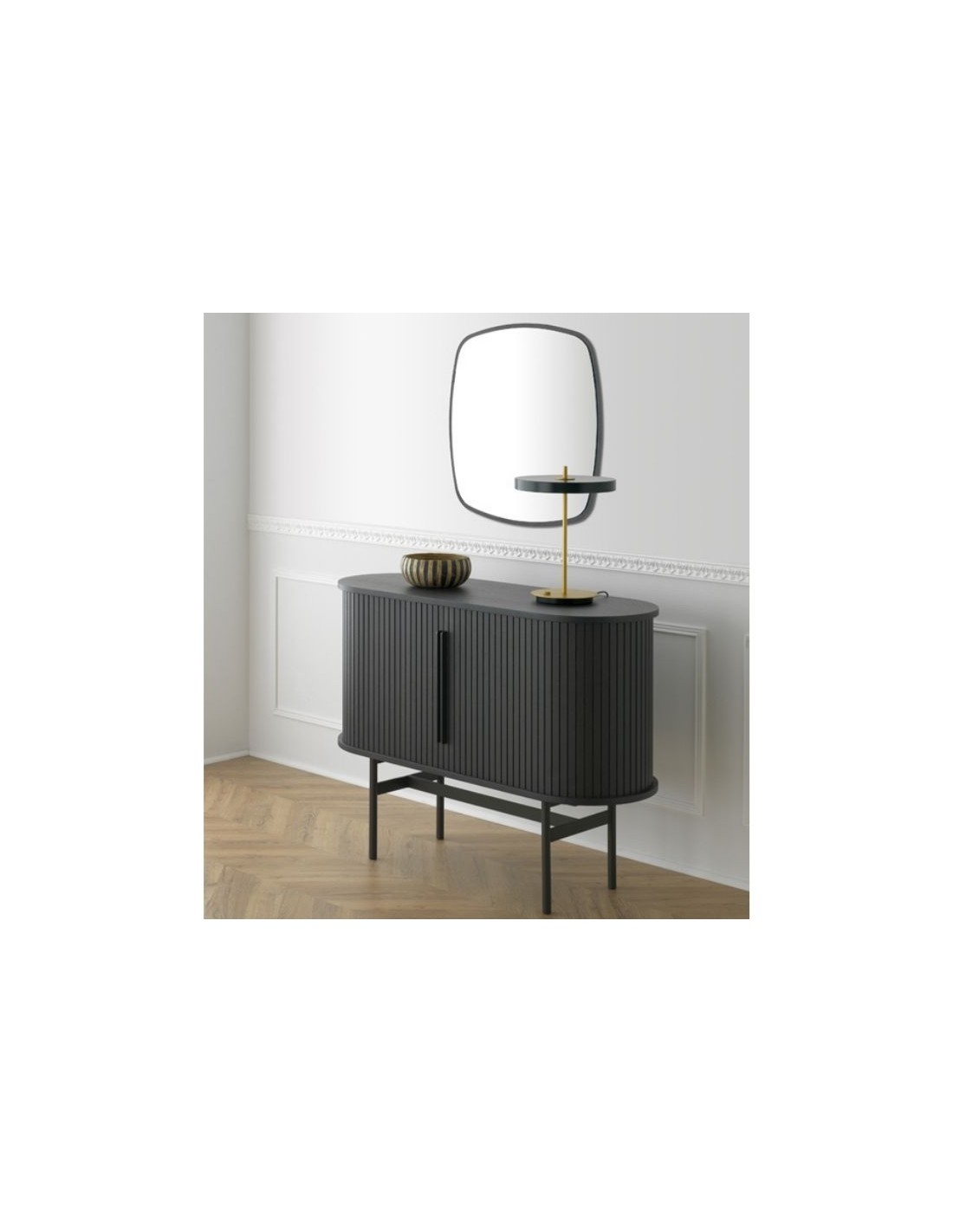 Quinta Sideboard small in wood, with a metal base and a perimetrical sliding roller.