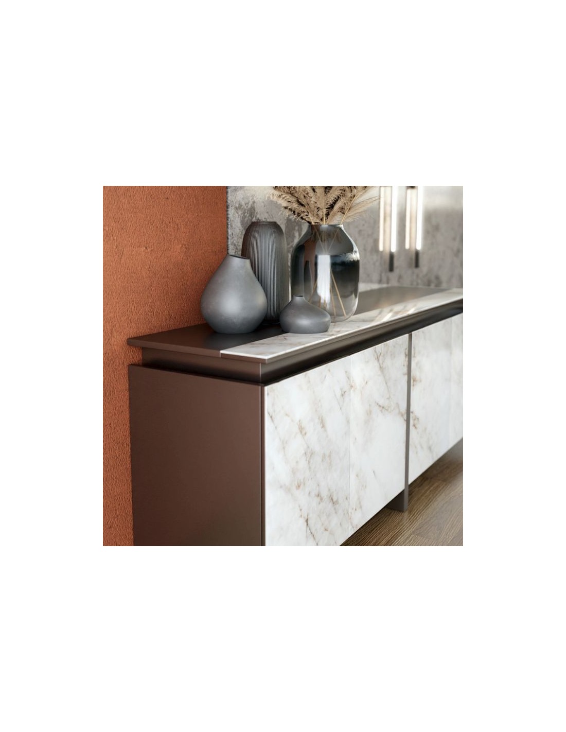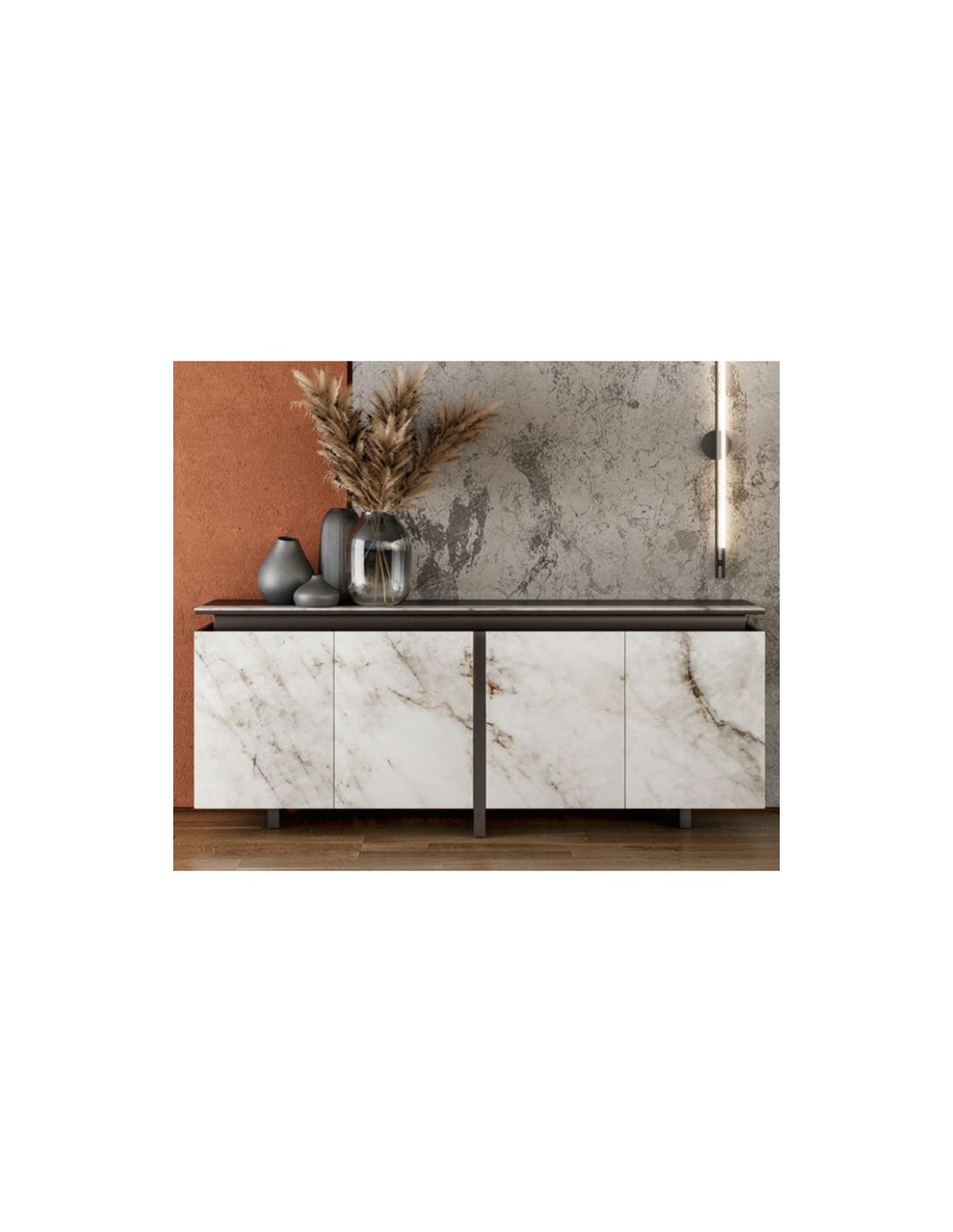 A modern sideboard of a minimalist, impressive design, with sliding doors.